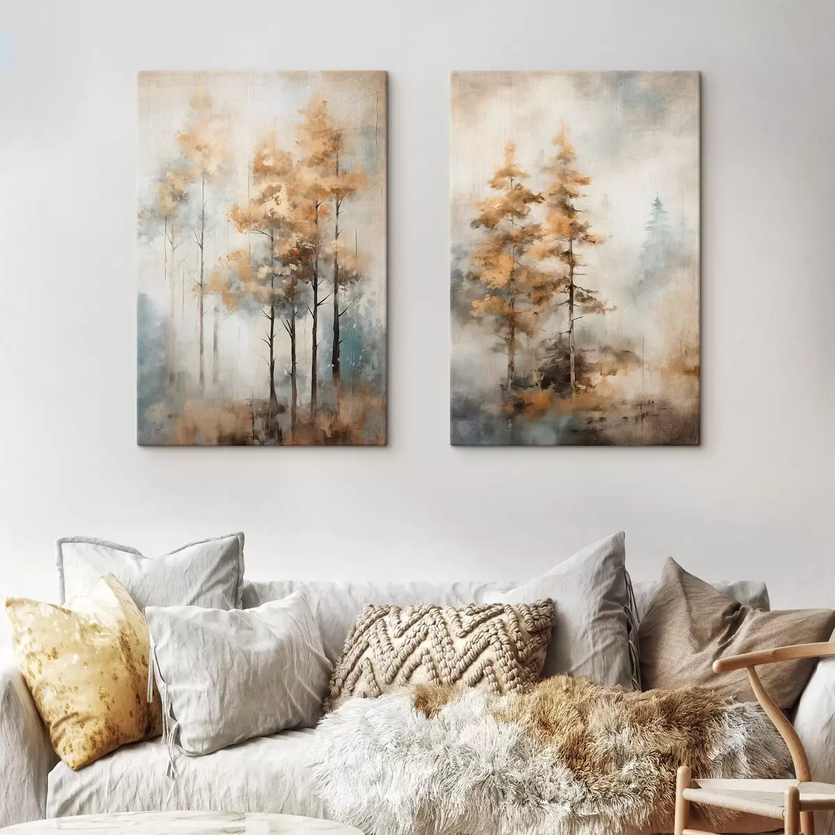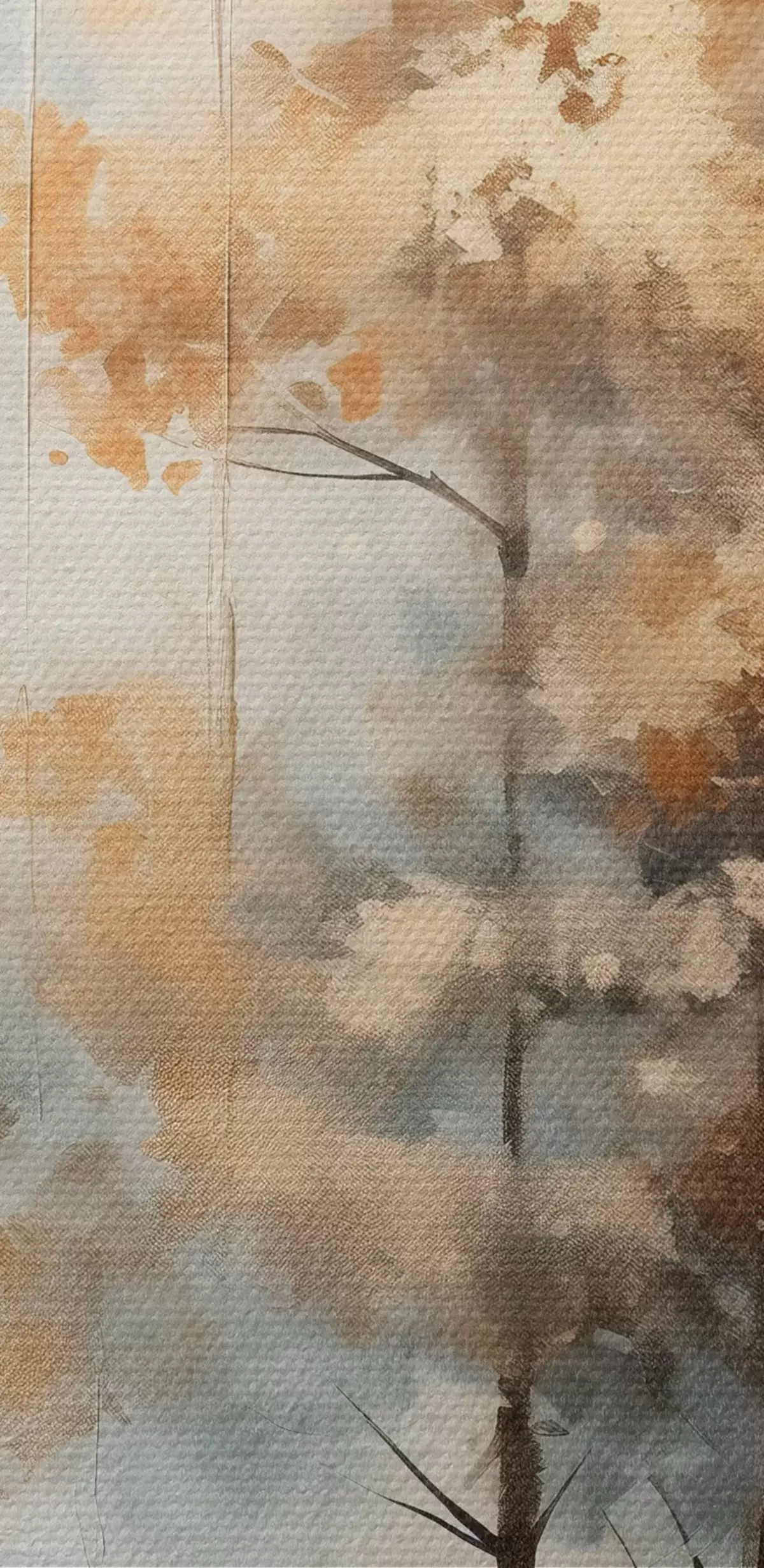 Obraz Textúrované vysoké stromy so žltými listami v lese , pozadie je zmesou jemných modrých a hnedých tónov Nr. m00528