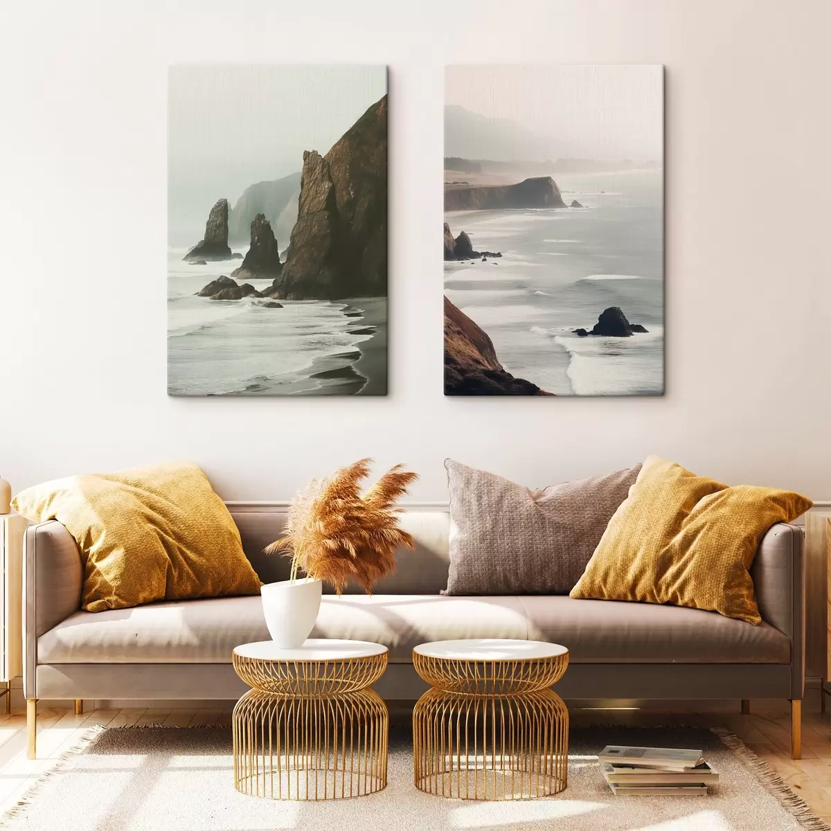 Obraz Skalnaté útesy a morské pobrežie, vlny narážajúce na breh, krajina s náladovou atmosférou, zemité tóny Nr. m00531