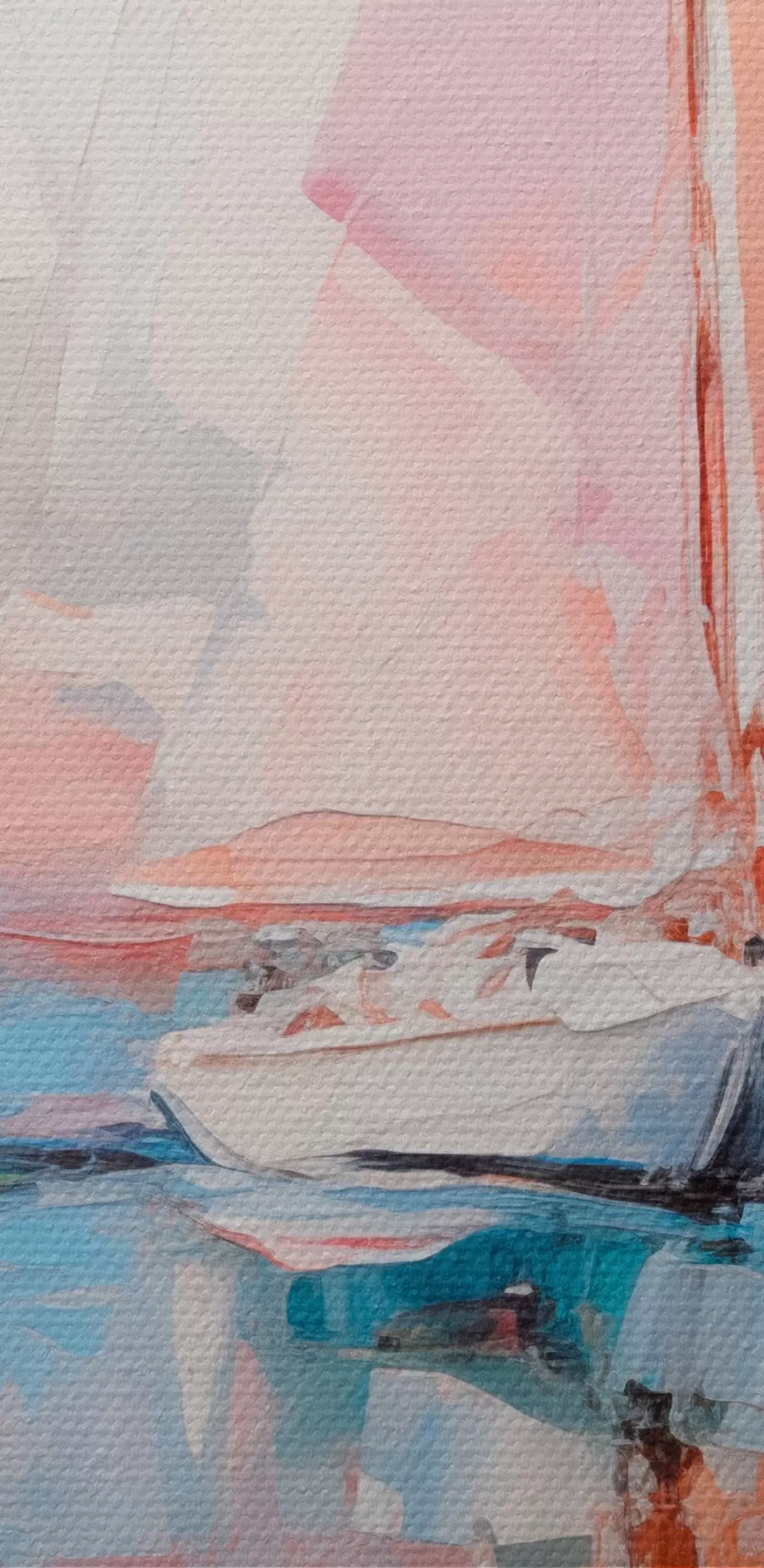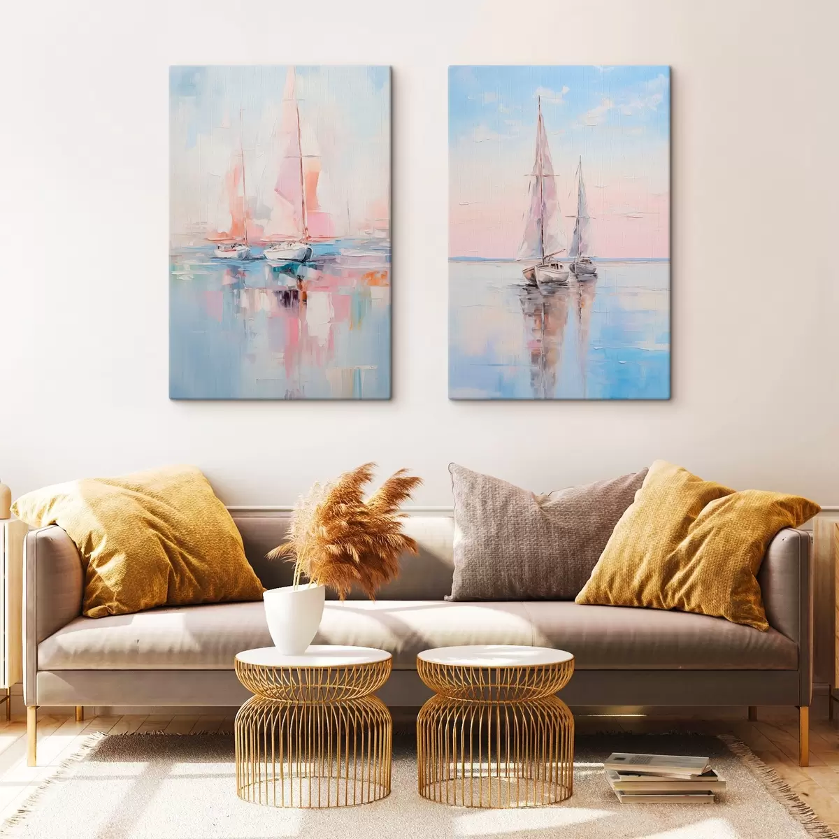 Obraz Plachetnice s ružovými plachtami plávajúce na pokojnom mori, odrazy lodí vo vode, jemné pastelové farby Nr. m00648