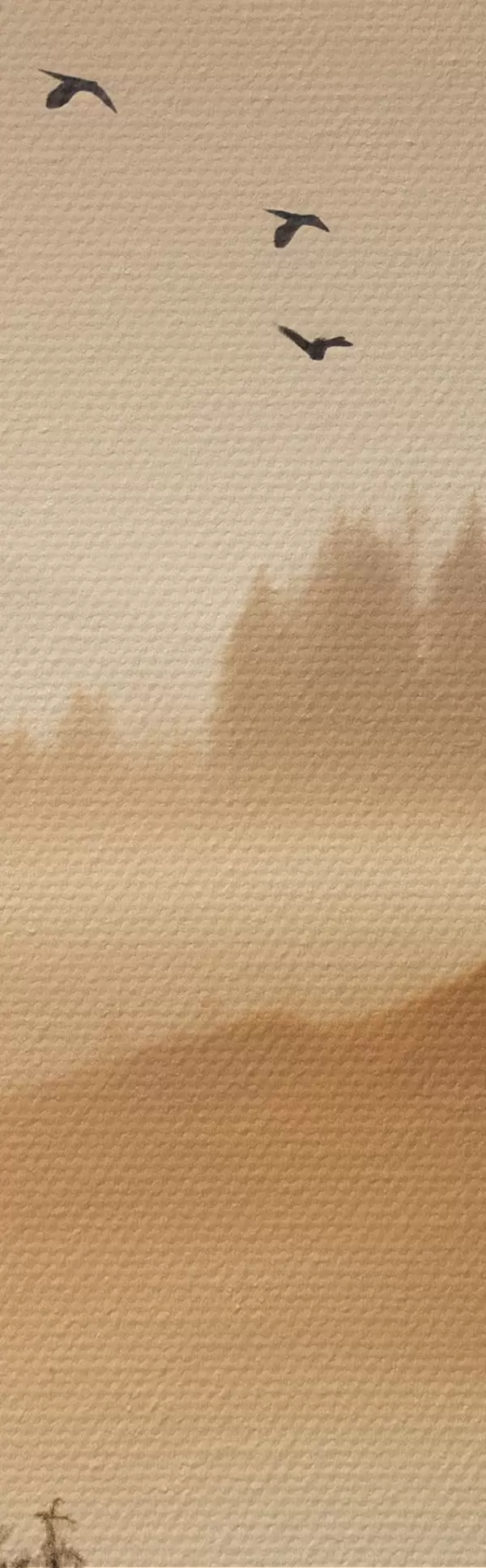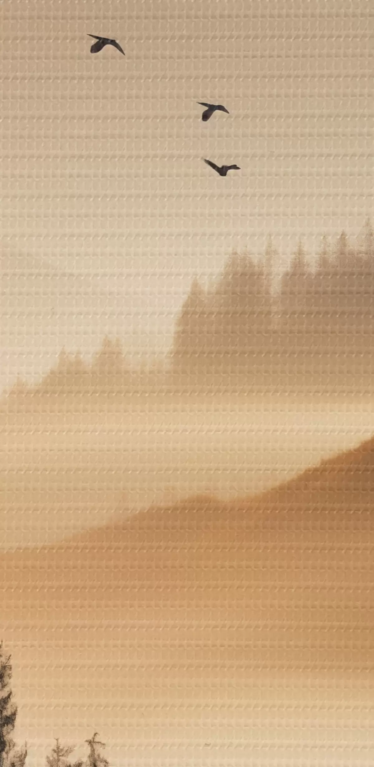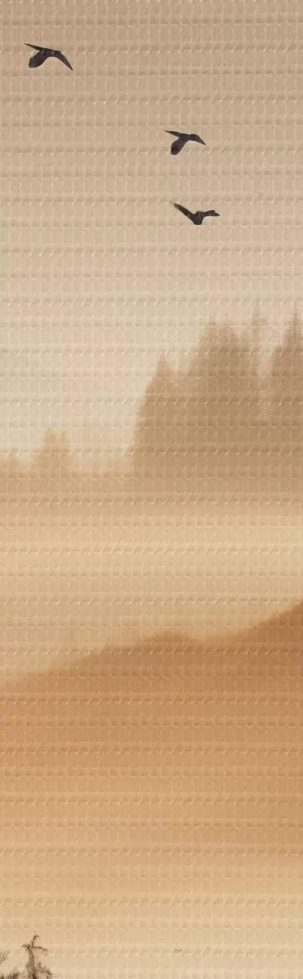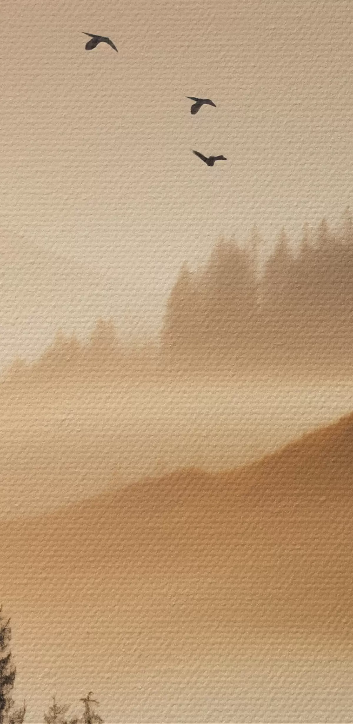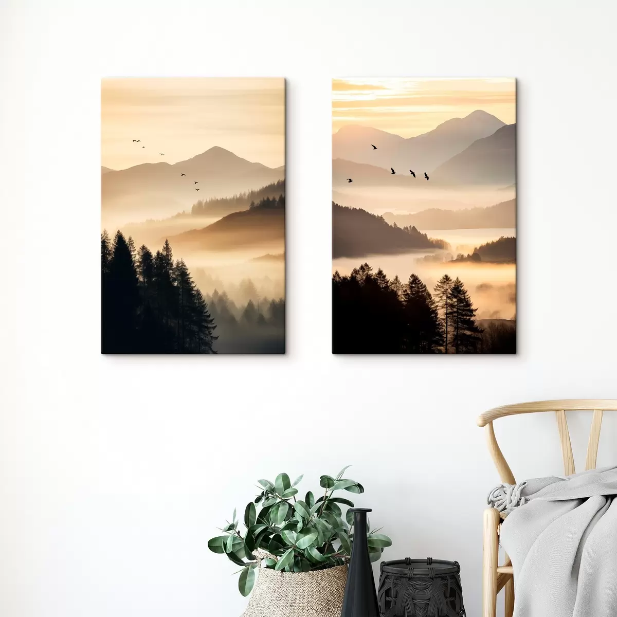 Obraz Horská krajina s lesom a vtákmi lietajúcimi na oblohe , všetko pokryté hustou vrstvou hmly počas východu slnka Nr. m00651