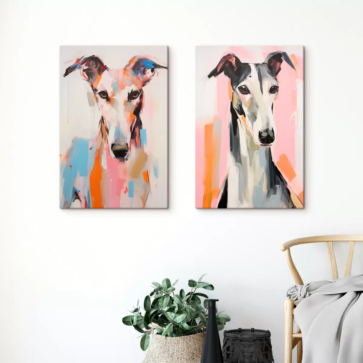 Obraz Chrtí pes namaľovaný žiarivými farbami, ako je oranžová, ružová a modrá, na obyčajnom bielom pozadí Nr. m00652