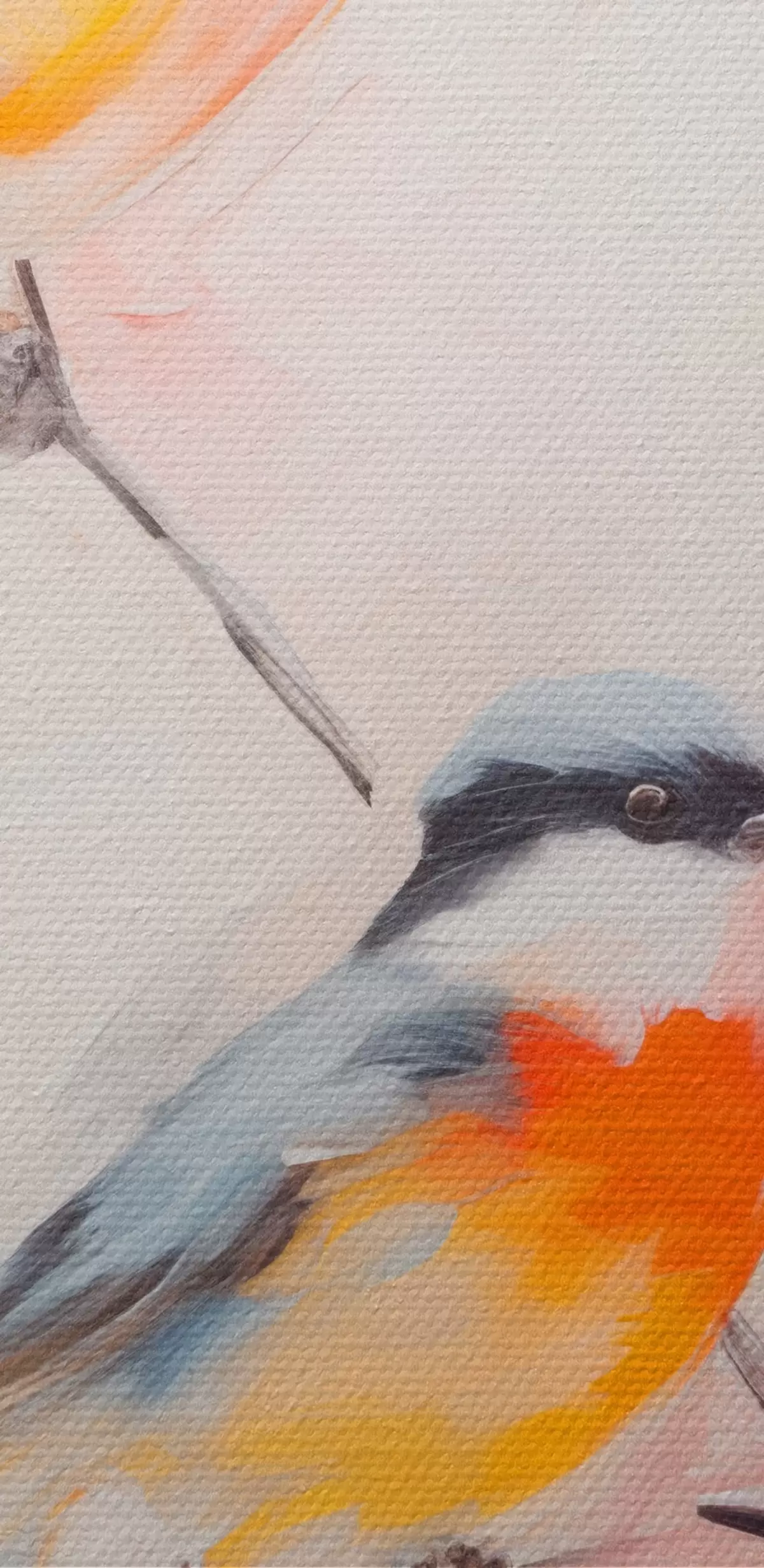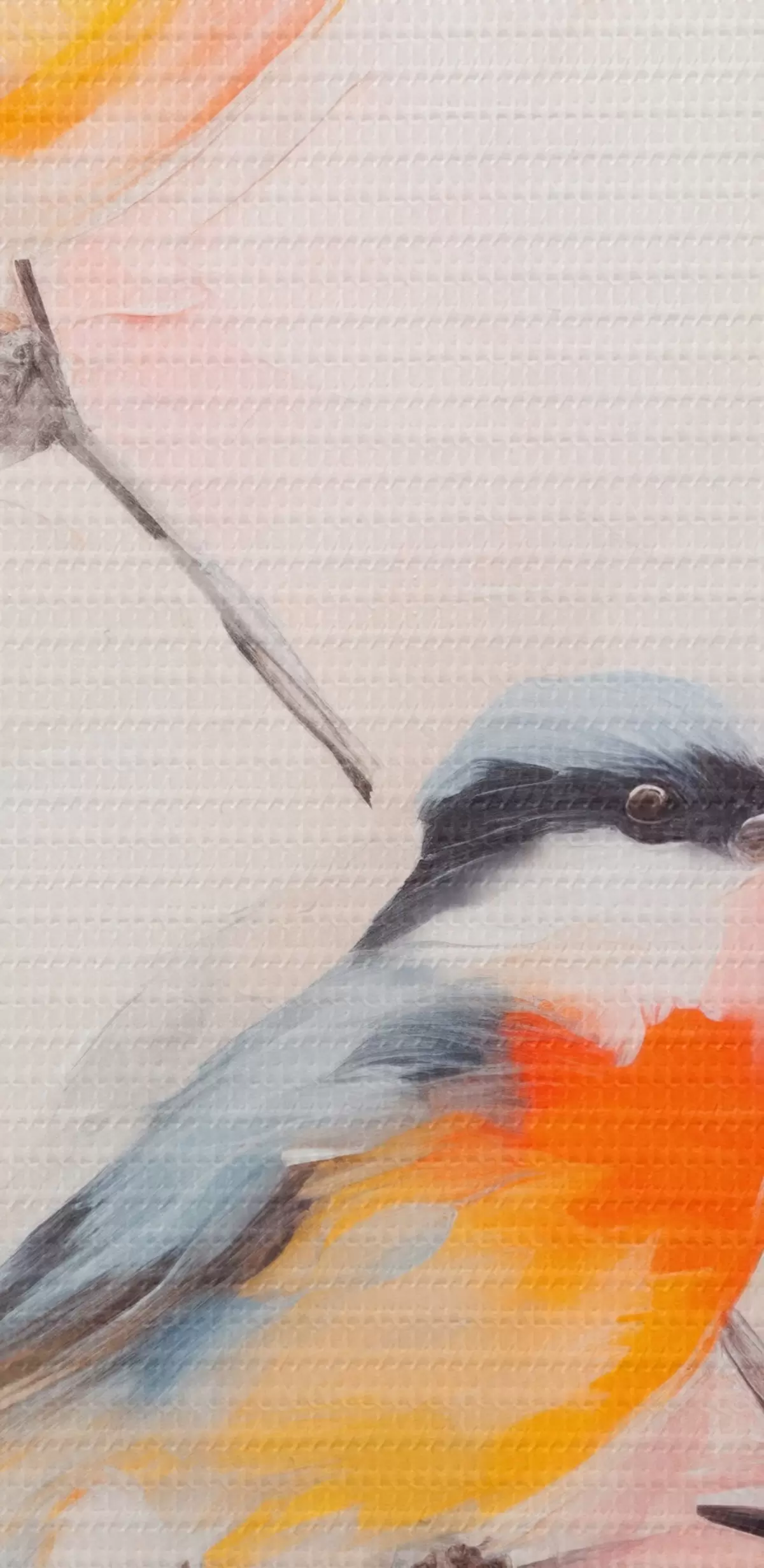 Obraz Vtáky sediace na konároch , jemné pastelové farby, svetlé pozadie s ružovými a bielymi odtieňmi Nr. m00658