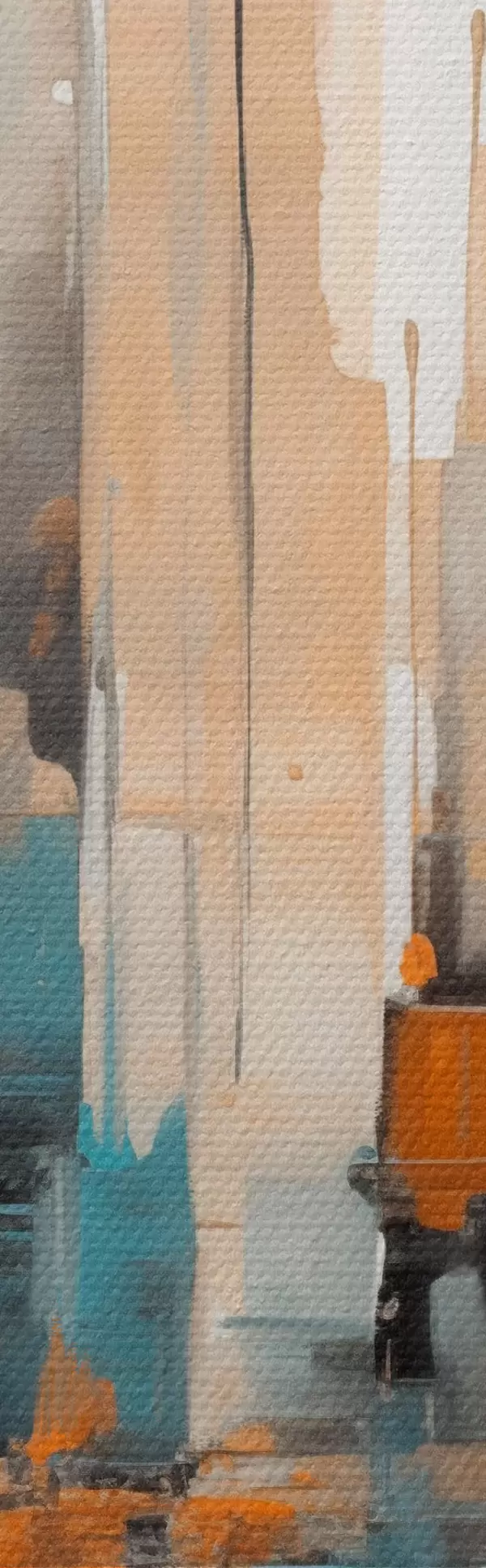 Obraz Abstraktný mestský panoráma s vertikálnymi ťahmi štetcom v odtieňoch oranžovej, modrej a bielej, maliarsky štýl Nr. m00876