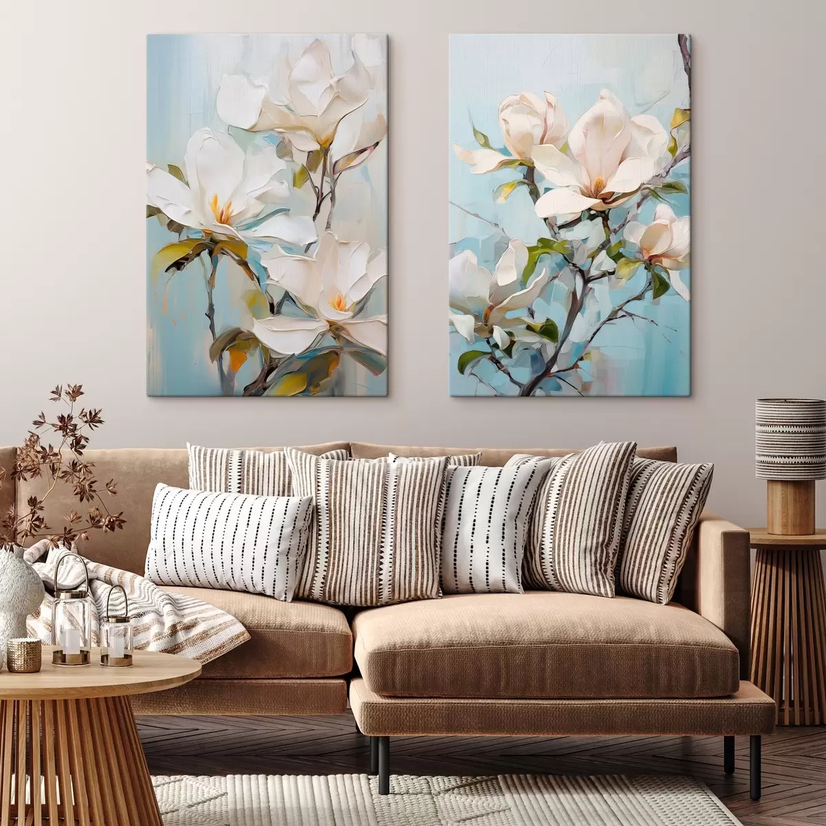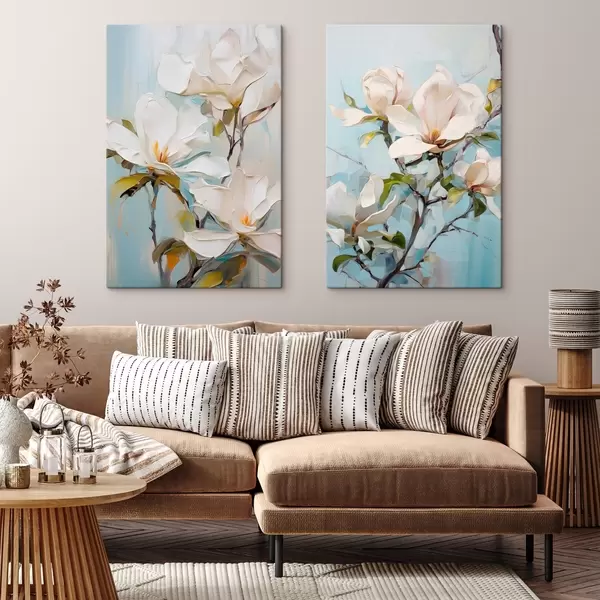 Obraz Biele kvety magnólie, svetlo modré pozadie s jemnými ťahmi štetca, štýl olejomaľby, impasto textúra Nr. m00881