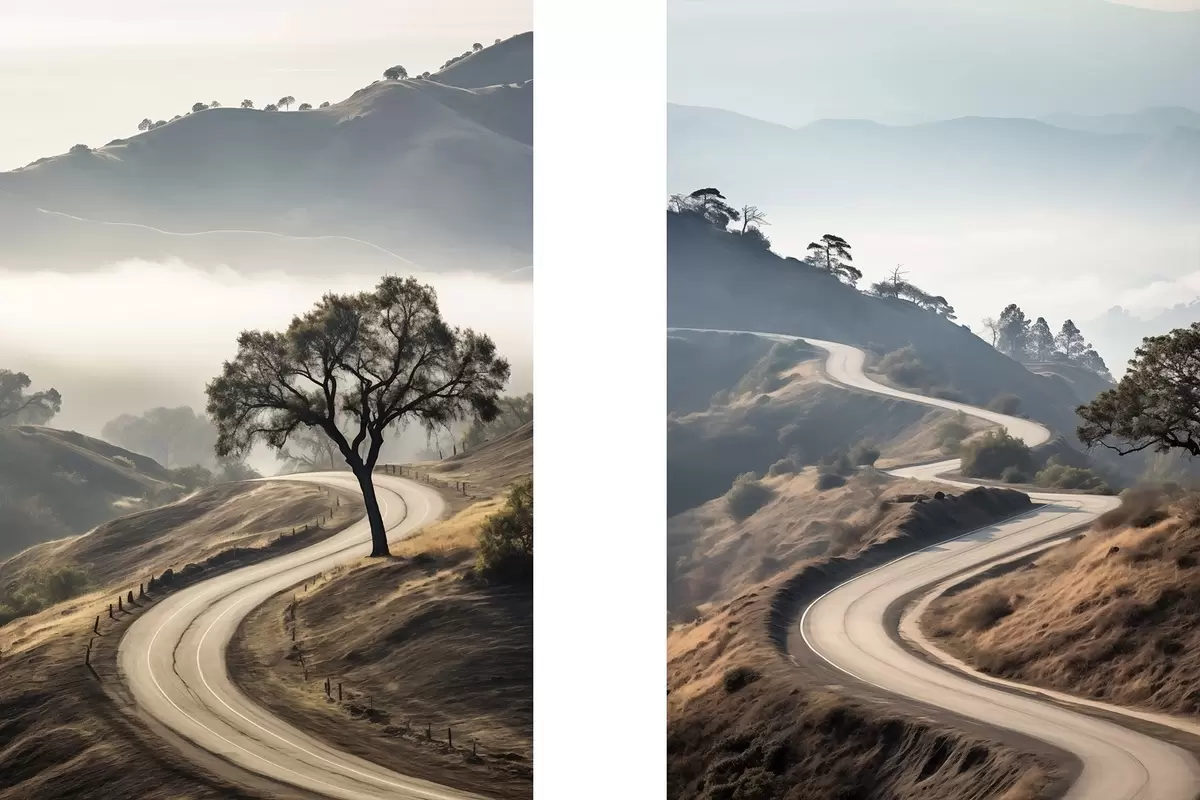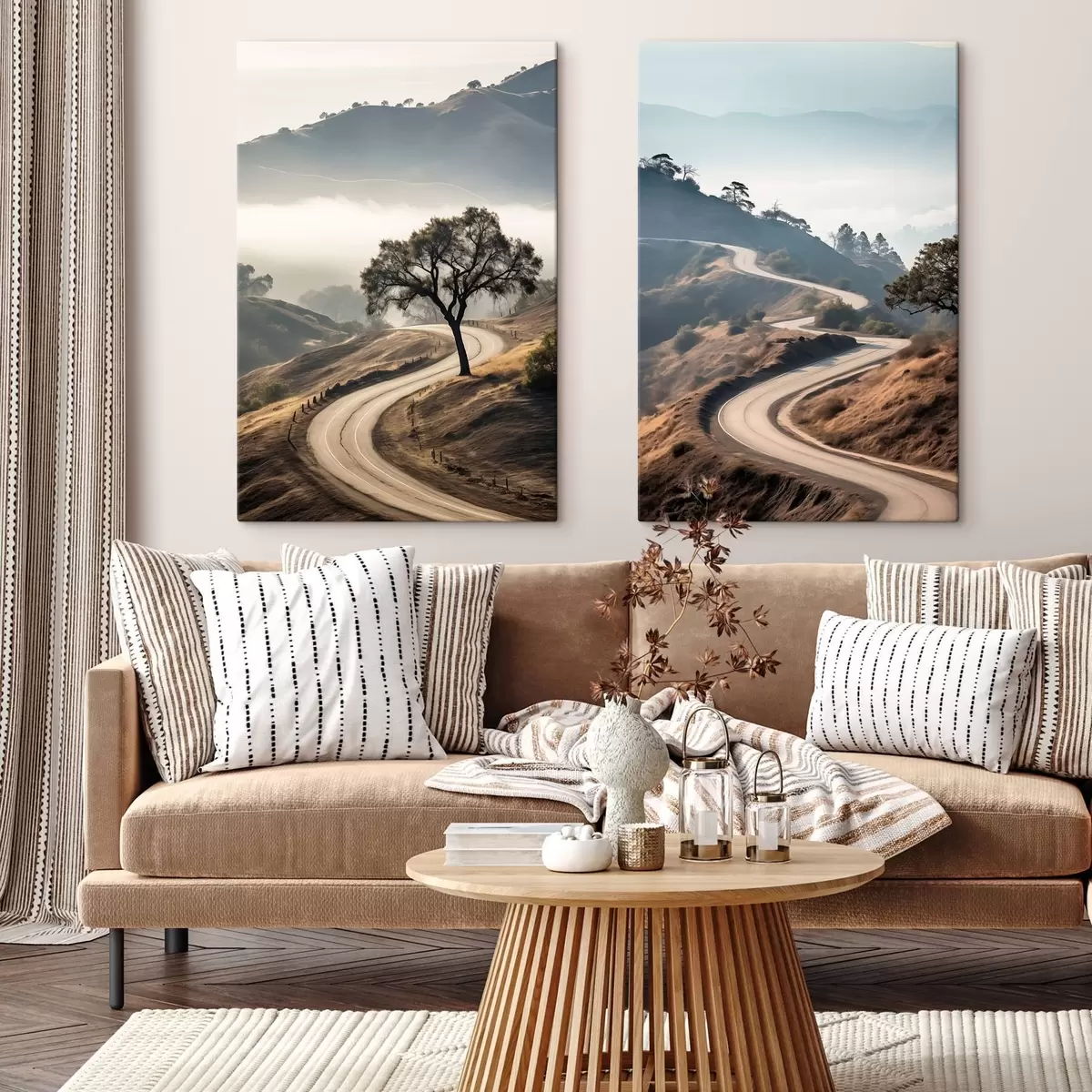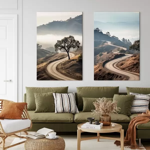 Obraz Kľukatá cesta cez kopcovitú krajinu so suchou trávou pod jasnou oblohou s horami v diaľke Nr. m00887