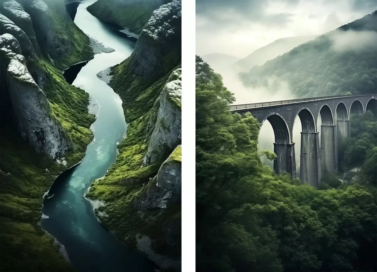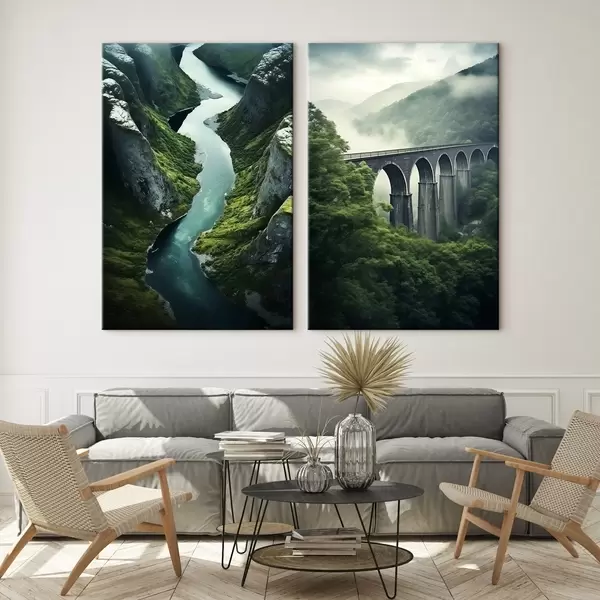 Obraz Vzdušný riečny kaňon a hmlistý viadukt v zelených kopcoch Nr. m00967