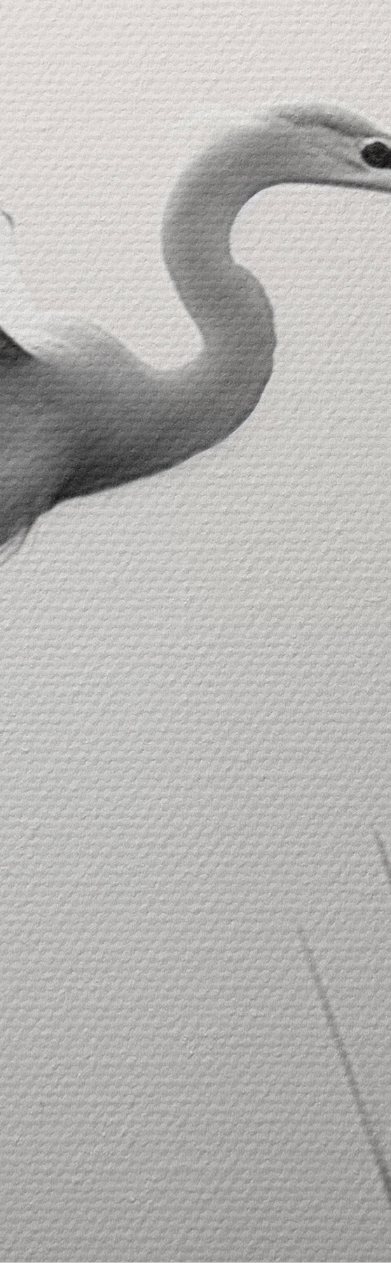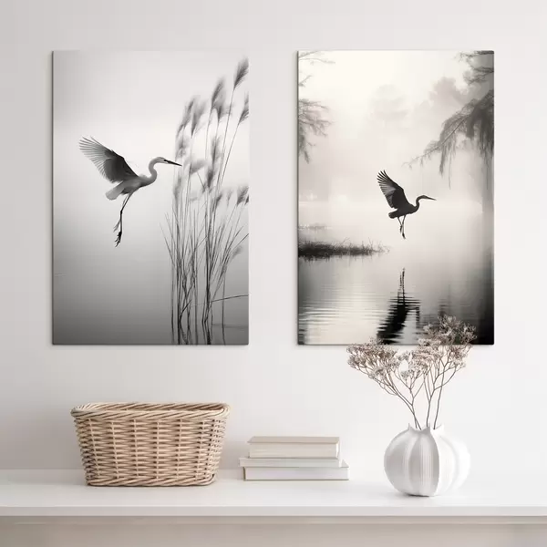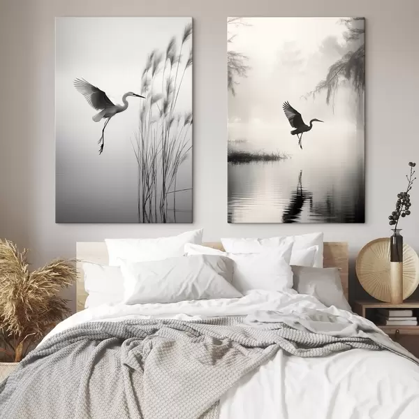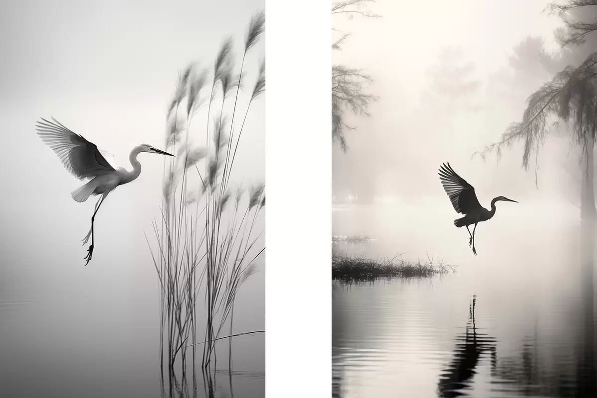 Obraz Biela volavka s roztiahnutými krídlami, letiaca v blízkosti vysokých trstín, čierno-biela minimalistická kompozícia Nr. m01007