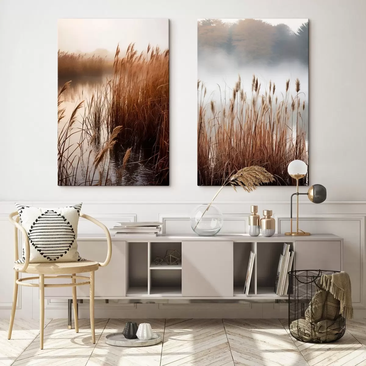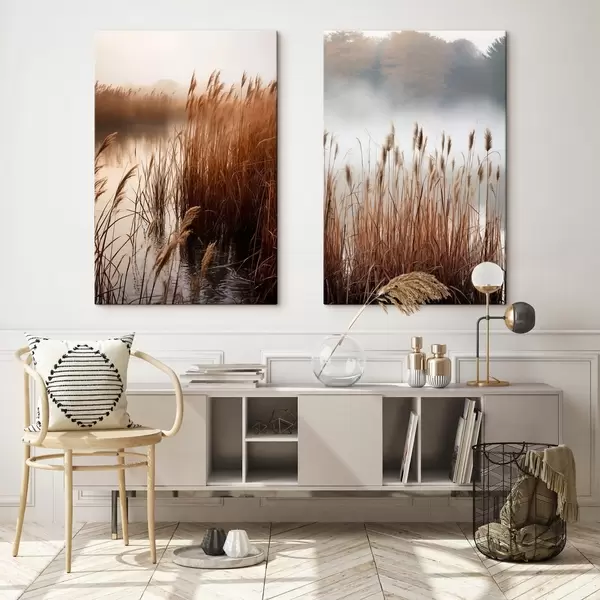 Obraz Vysoké trstiny rastúce vo vode, voda odráža trstiny, hmlisté pozadie, mäkké svetlo, prírodná scéna Nr. m01008