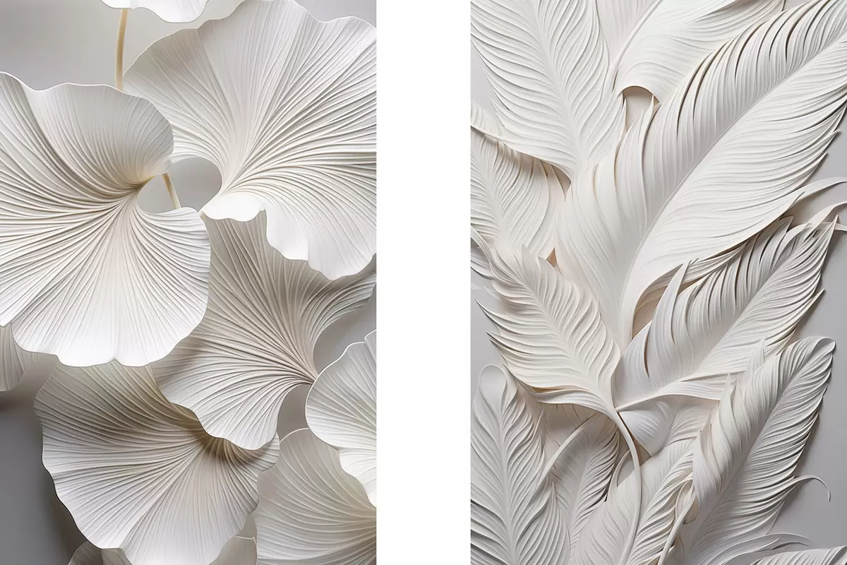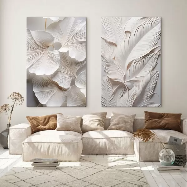 Obraz Biele listy ginkga a dlhé listy so zložitými detailmi, ktoré vytvárajú textúrovaný a vrstvený efekt, minimalistické umenie Nr. m01013