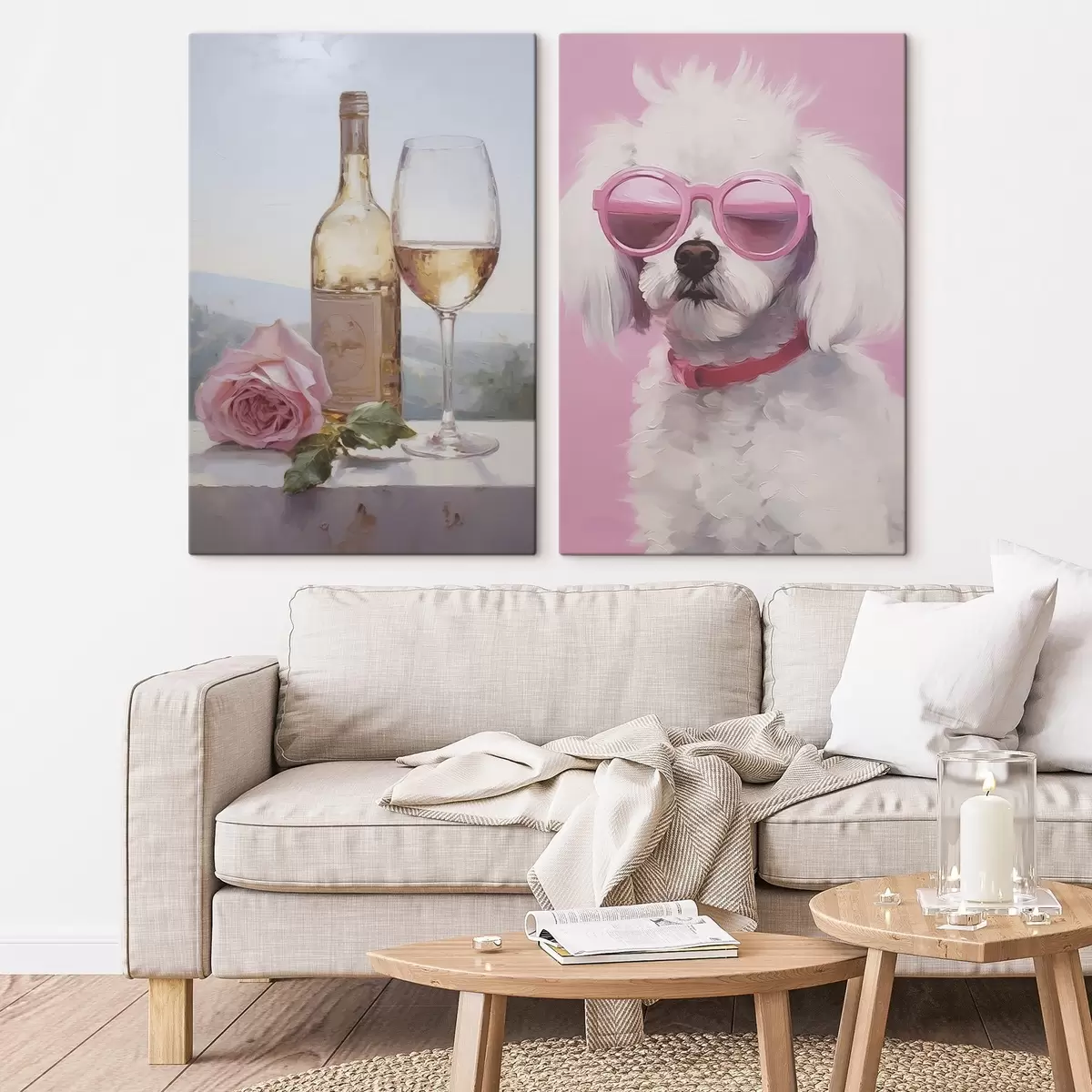 Obraz Fľaša a pohár vína a pudel s okuliarmi, imitácia maľby Nr. m01021
