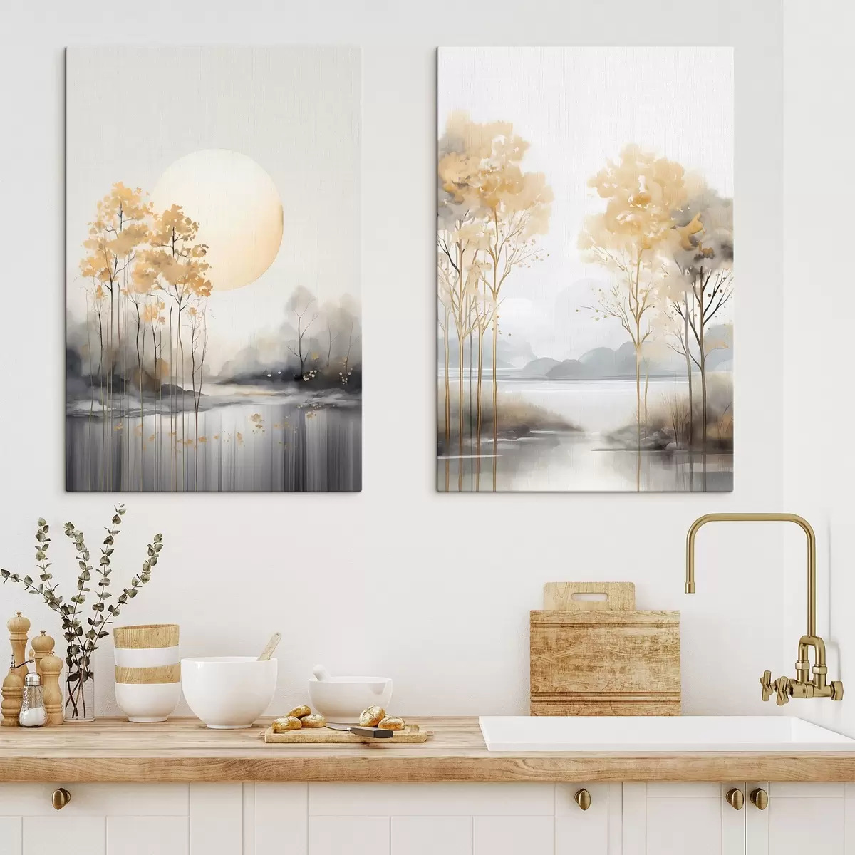 Obraz Dekoratívna abstraktná krajina, vysoké stromy so žltými listami, rieka a hmla v pozadí Nr. m01115