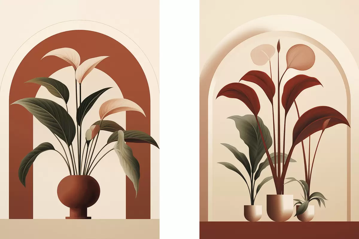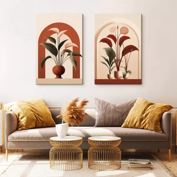 Obraz Abstraktné rastliny v kvetináčoch s veľkými zelenými a červenými listami pred krémovou bránou Nr. m01124