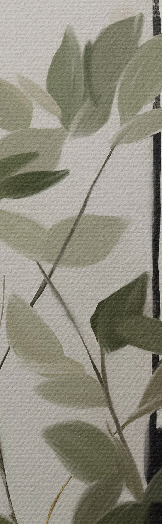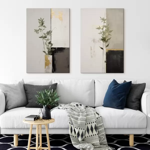 Obraz Minimalistická textúrovaná maľba vázy so zelenými listami na pozadí abstraktných geometrických tvarov Nr. m01126