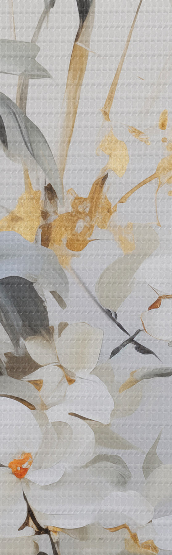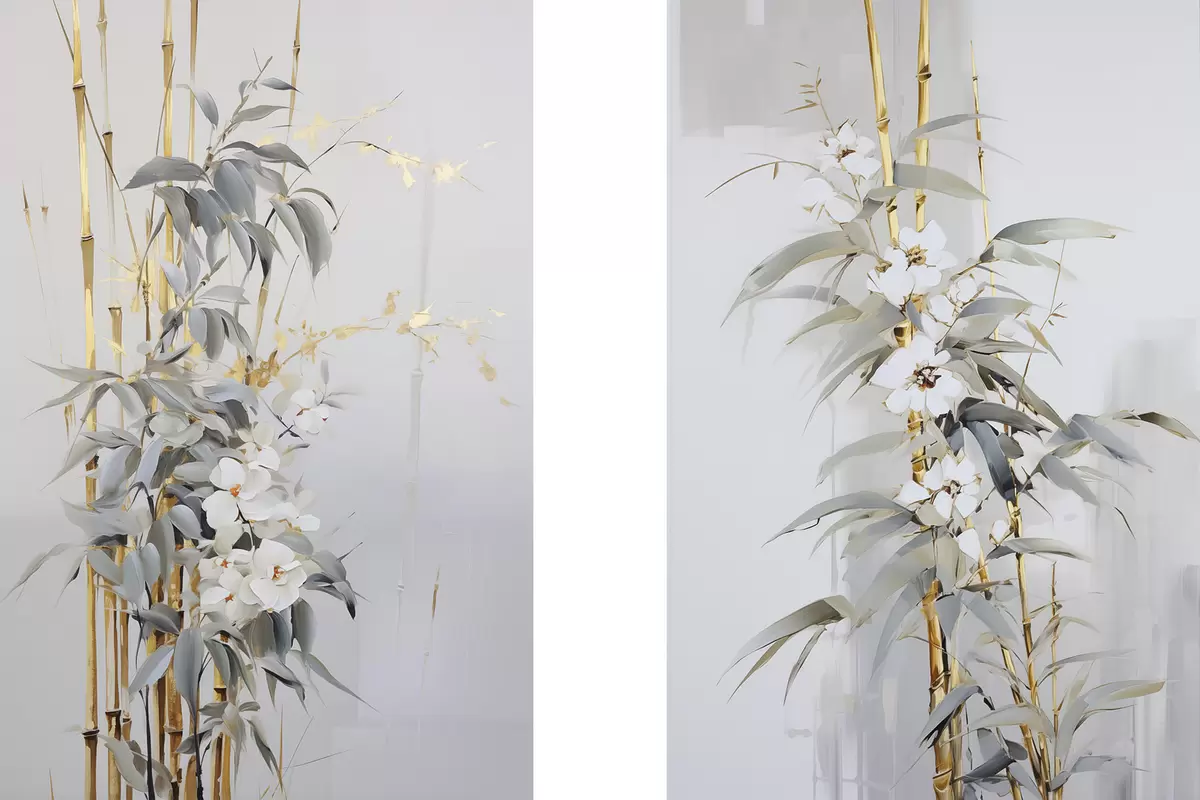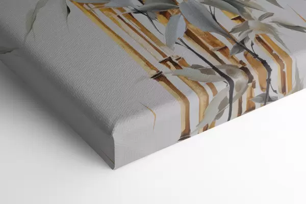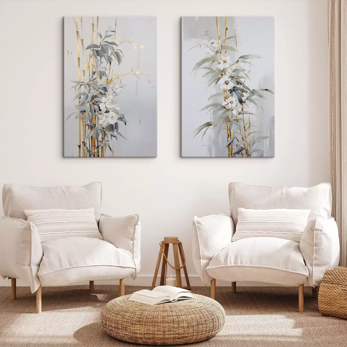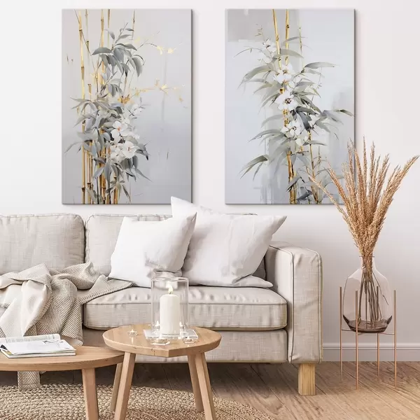 Obraz Abstraktné bambusové stonky so žltými akcentmi, jemnými bielymi kvetmi a bledo zelenými listami, sivé pozadie Nr. m01127