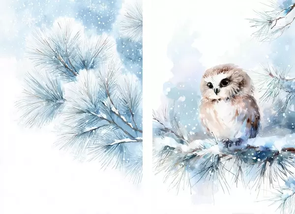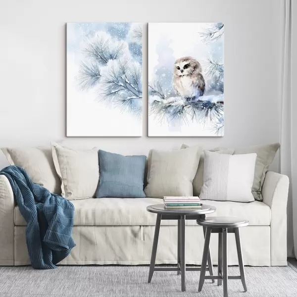 Obraz roztomilá sova na zasneženej borovicovej vetve v akvarelovom štýle Nr. m01168