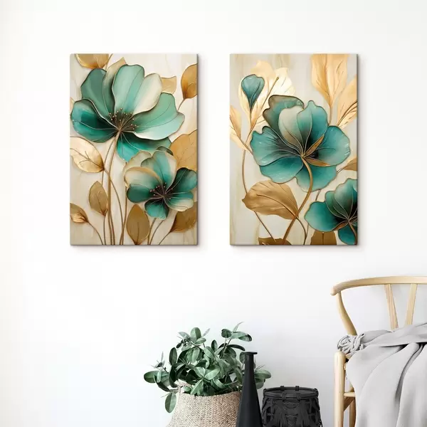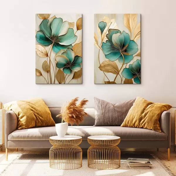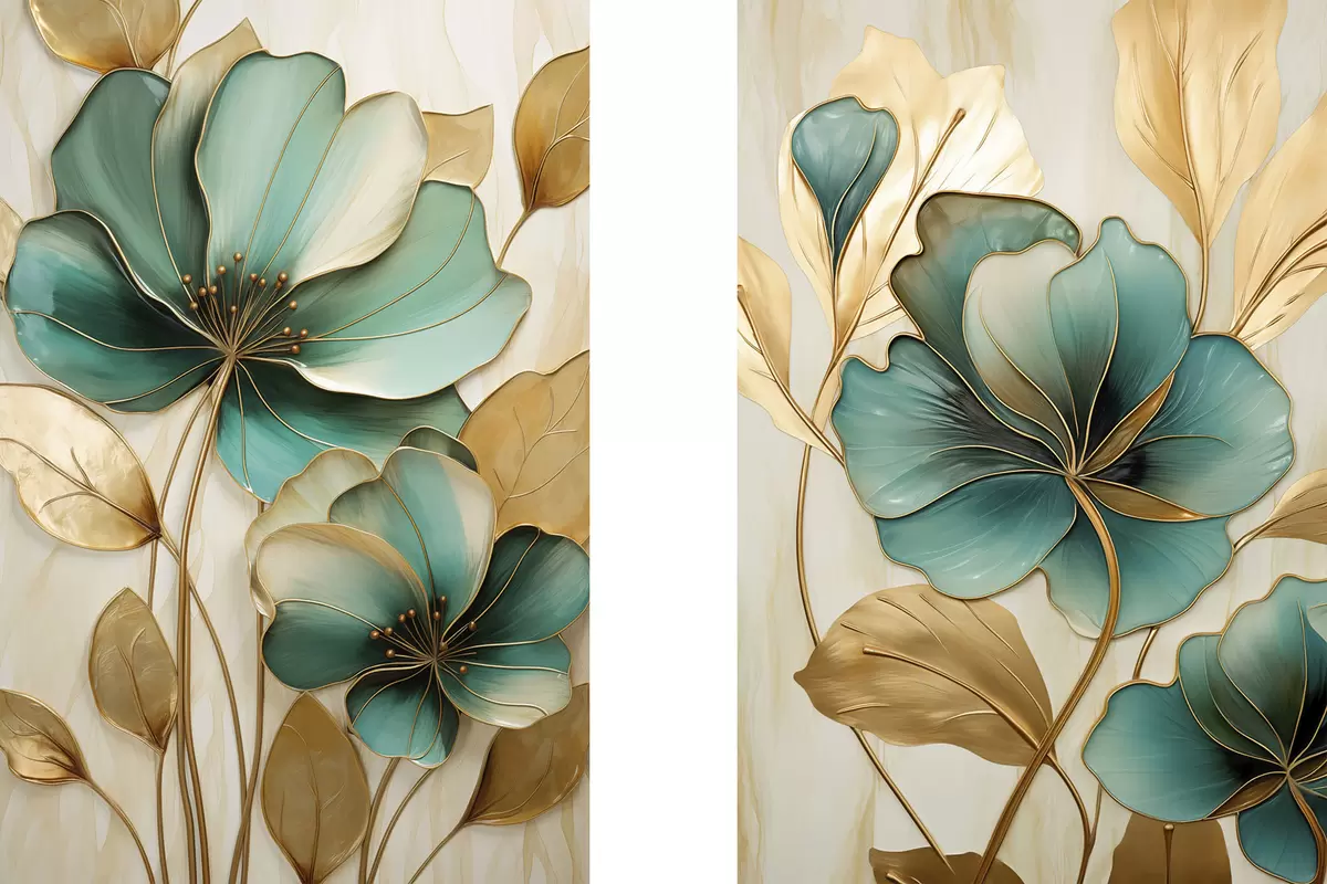 Obraz Veľké modrozelené a žlté kvety s obrysmi, obklopené žltými listami na abstraktnom pozadí Nr. m01235