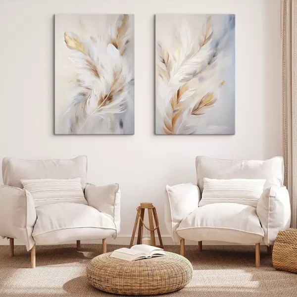 Obraz Veľké, mäkké perie s kombináciou bielych, žltých a hnedých odtieňov na svetlom, abstraktnom pozadí. Nr. m01247