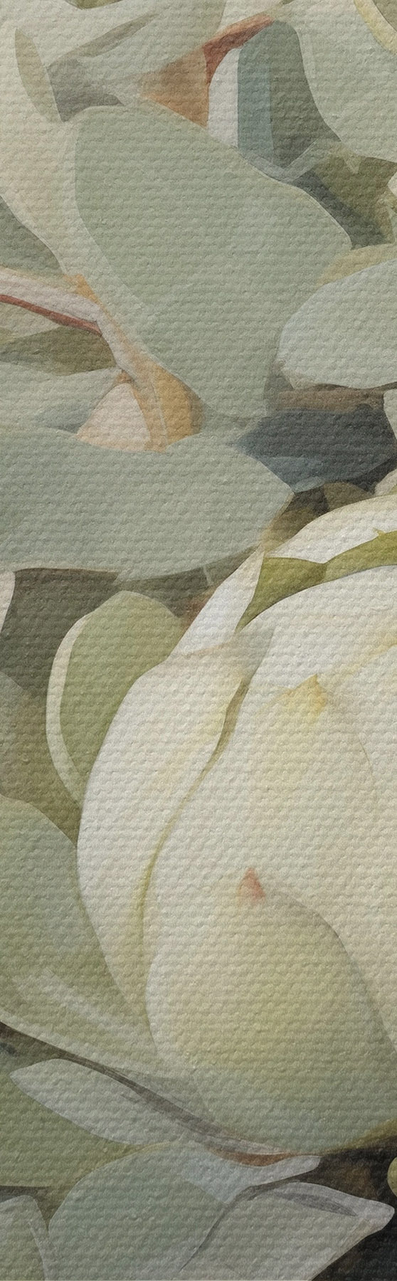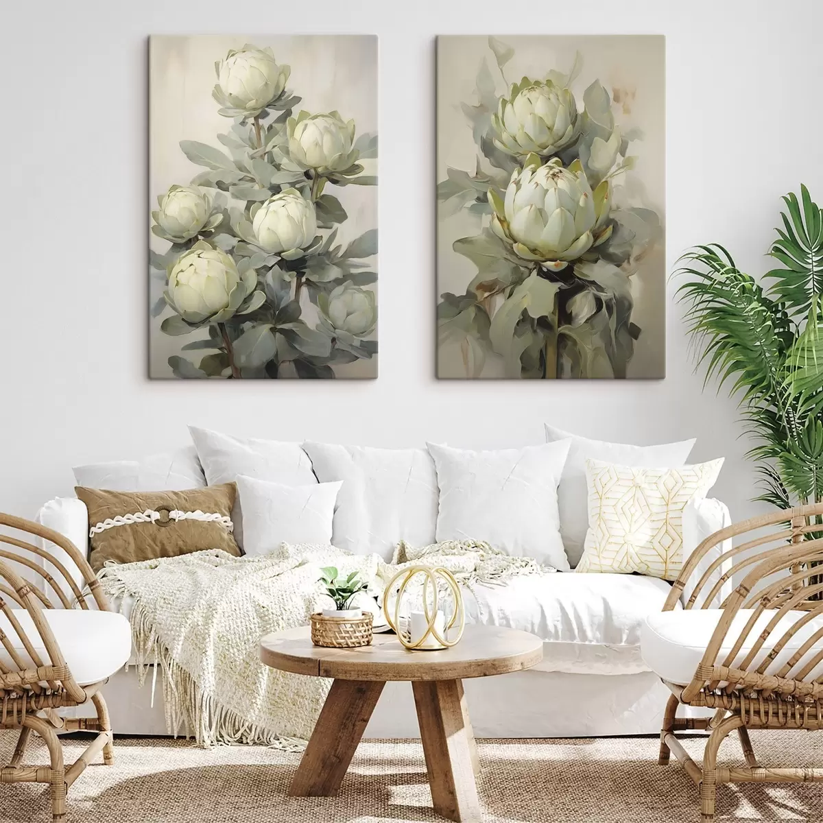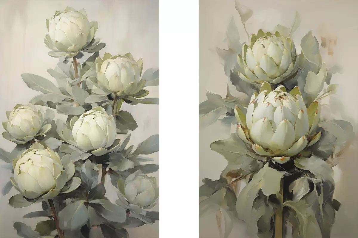 Obraz Maľba niekoľkých bielych kvetov protey s veľkými zelenými listami na svetlom pozadí Nr. m30051