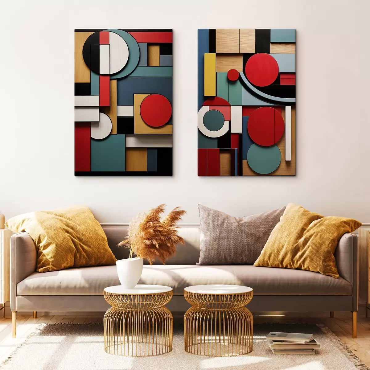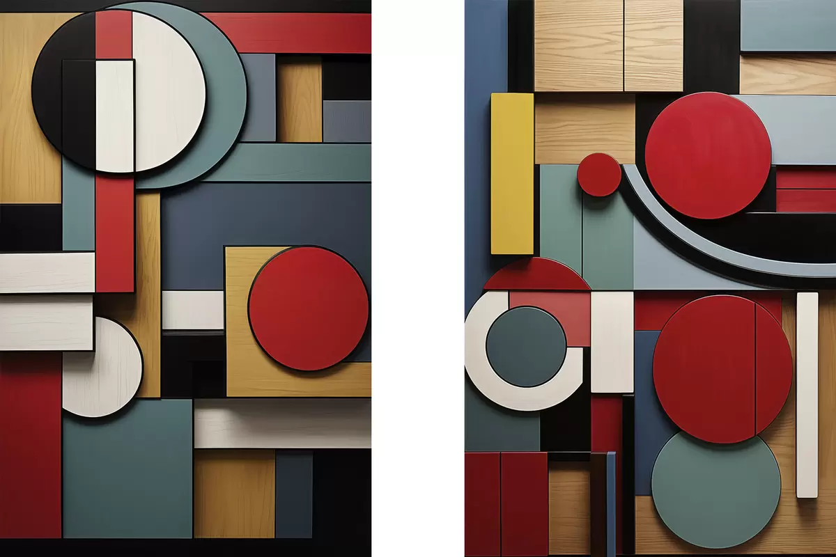 Obraz Abstraktná geometrická kompozícia s imitáciou drevenej textúry, červenými, čiernymi, bielymi a tyrkysovými obdĺžnikmi a kruhmi Nr. m30058