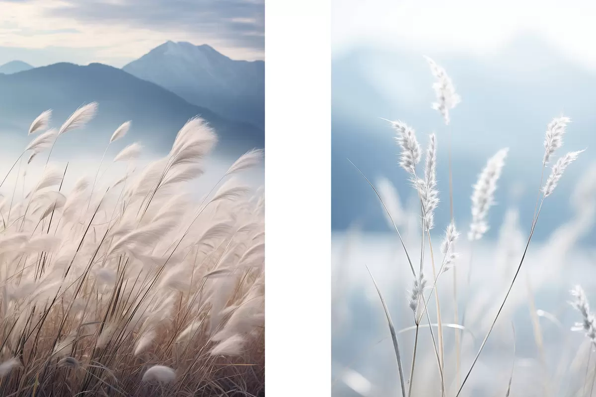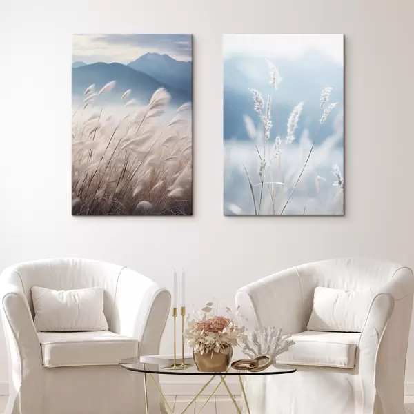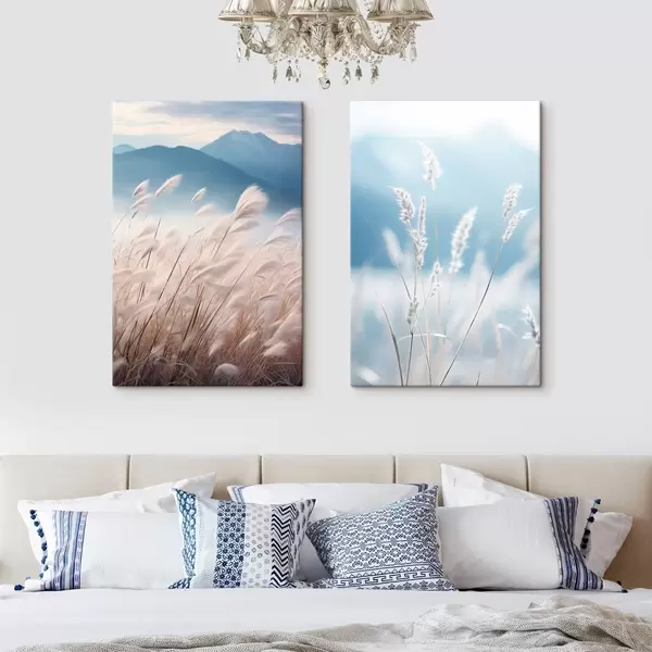 Obraz Vysoká, biela tráva pampasová vlajúca vo vetre s jemnými modrými horami v pozadí Nr. m30060
