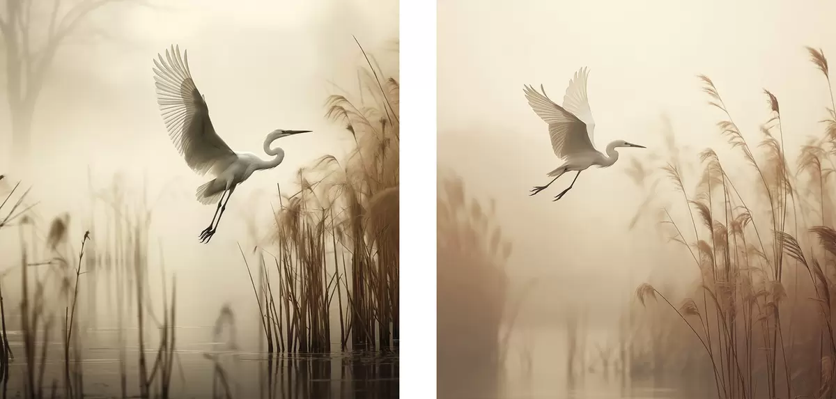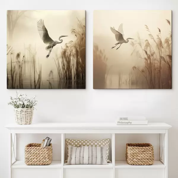 Obraz Nad jazerom lieta biela volavka, v pozadí ju obklopujú vysoké trstiny a stromy Nr. m30199