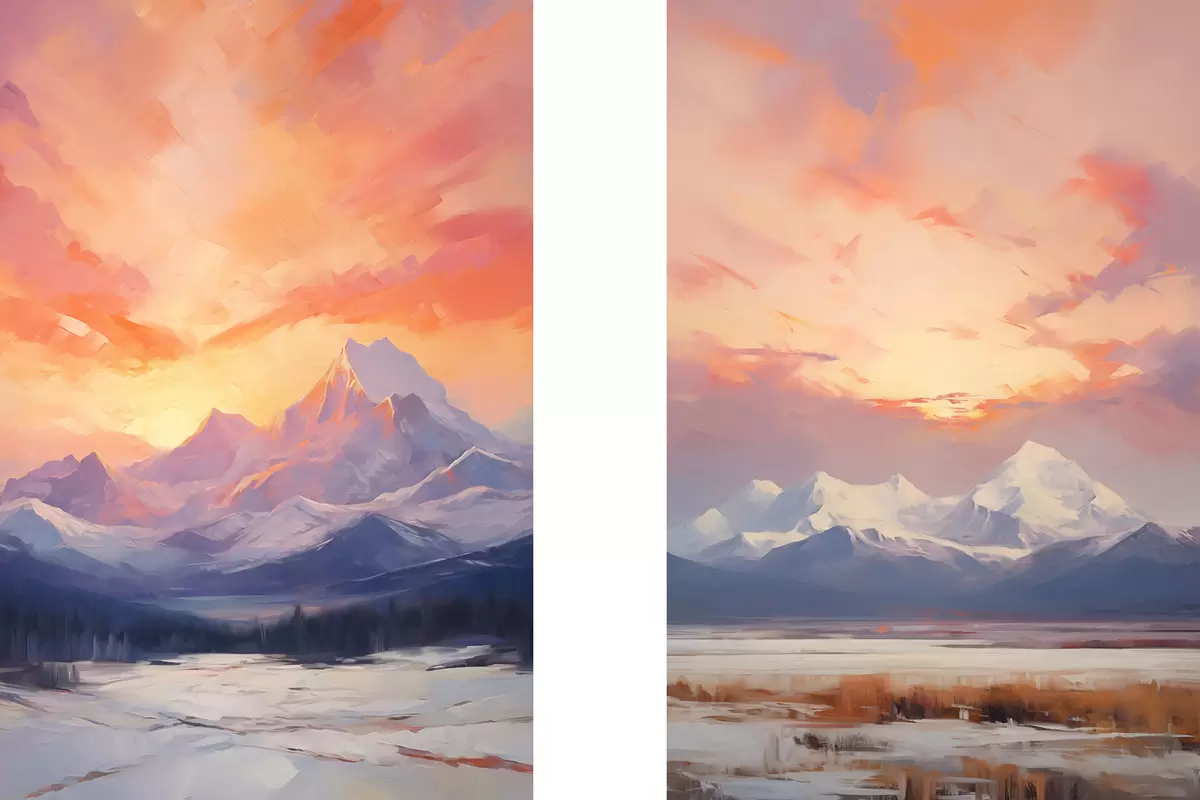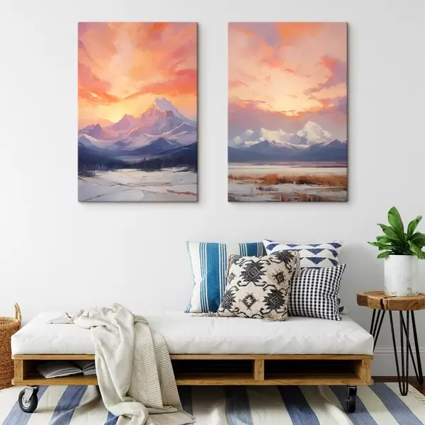 Obraz Zasnežené vrchy pod žiarivo oranžovou a ružovou oblohou s mrakmi Nr. m30321