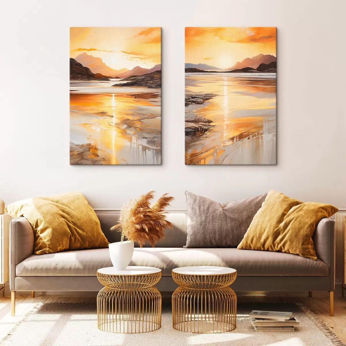 Obraz Krajina s riekou a horami pod teplou oranžovou oblohou, západ slnka Nr. m30328