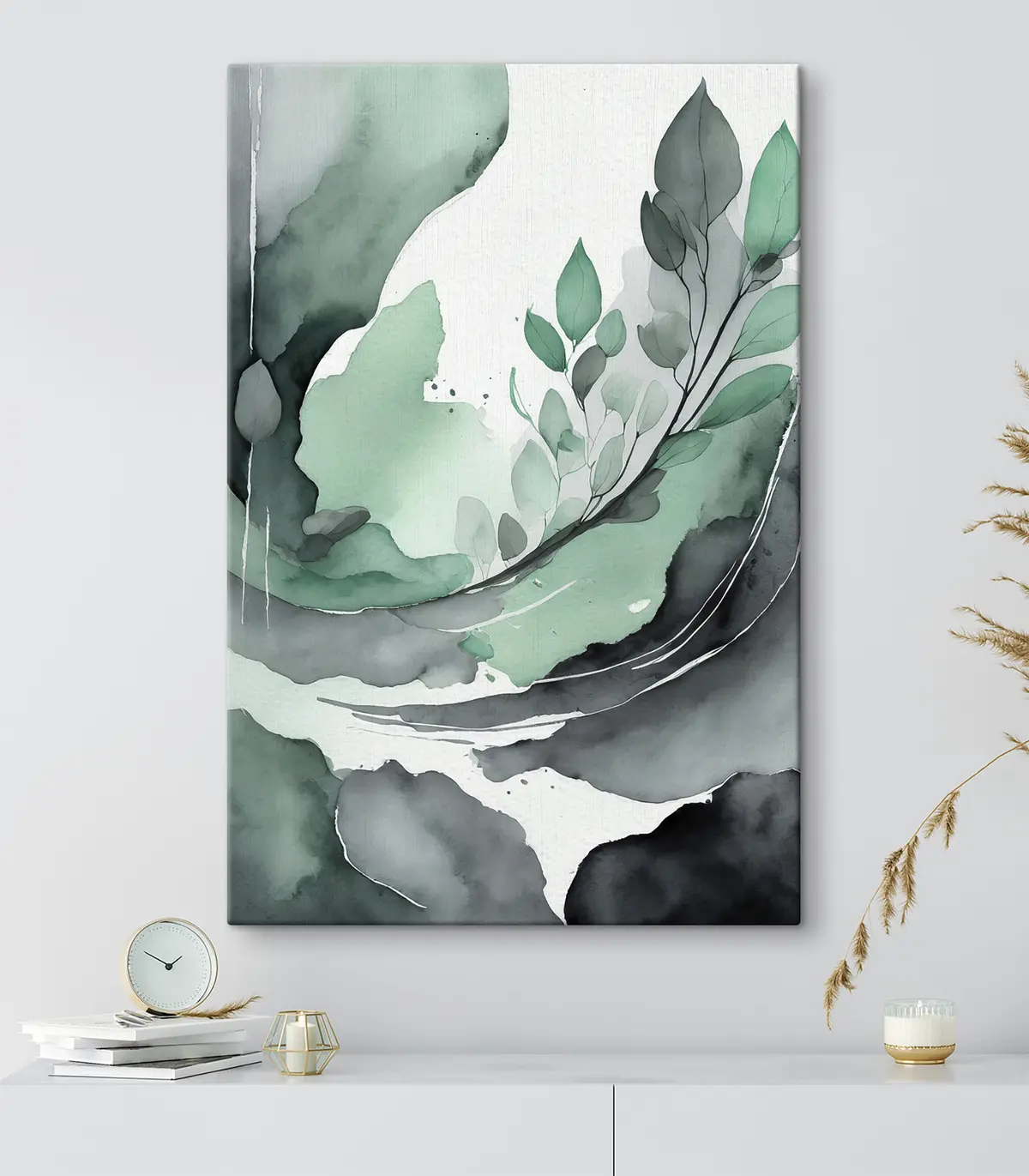 Obraz Akvarelová abstraktná kresba s rastlinou, prírodné zelené a sivé farby Nr. s36502