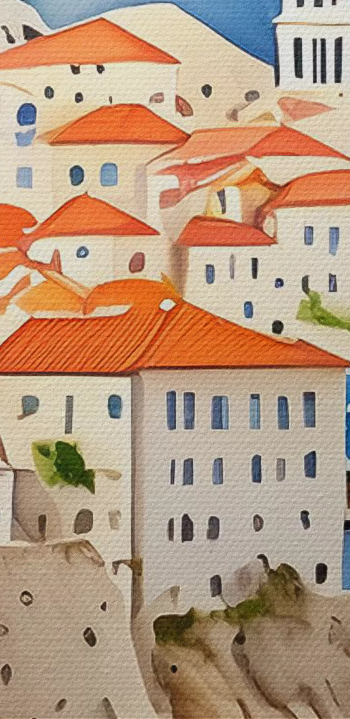 Obraz Stredomorská architektúra, akvarel, letné kvety, modré more, hory Nr. s38408