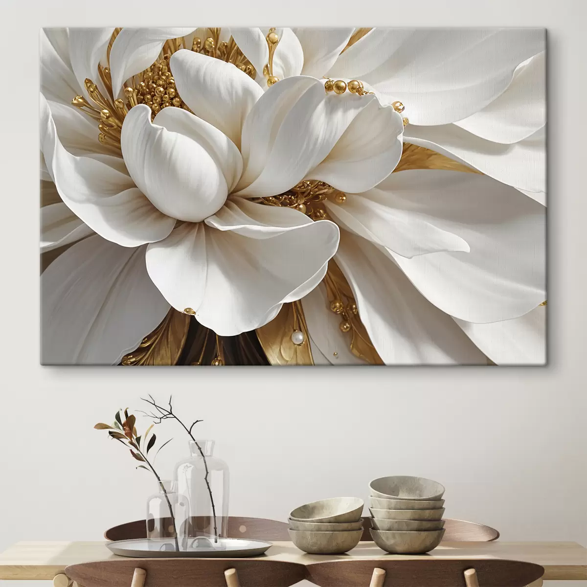 Obraz Detailný záber na veľký biely kvet s jemnými okvetnými lístkami a tyčinkami v strede minimalizmu Nr. s38762