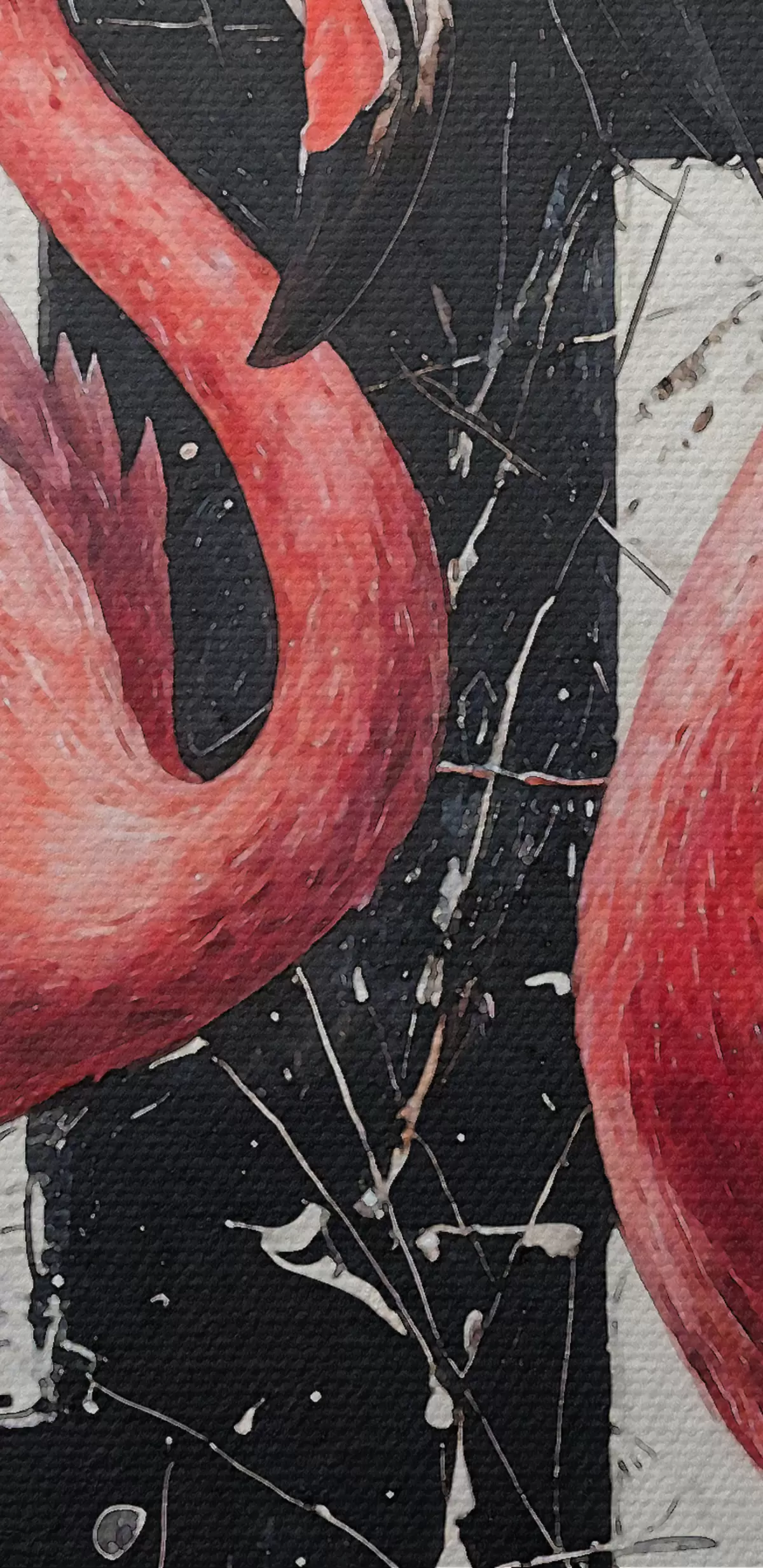 Obraz Dva ružové plameniaky stojace pred čiernobielym abstraktným obrazom na pozadí Nr. s38954
