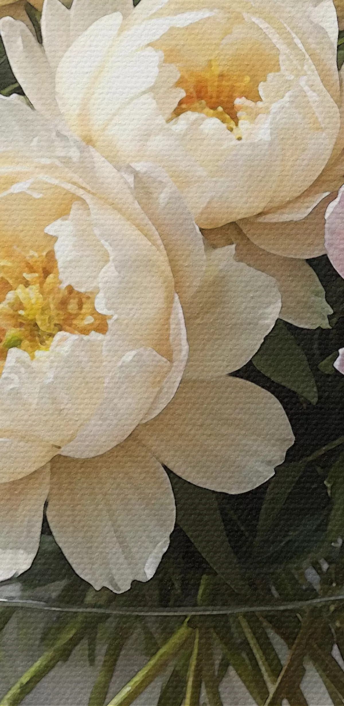 Obraz Maľba kytice krásnych bielych a ružových pivónií v sklenenej váze na drevenom stole Nr. s38967