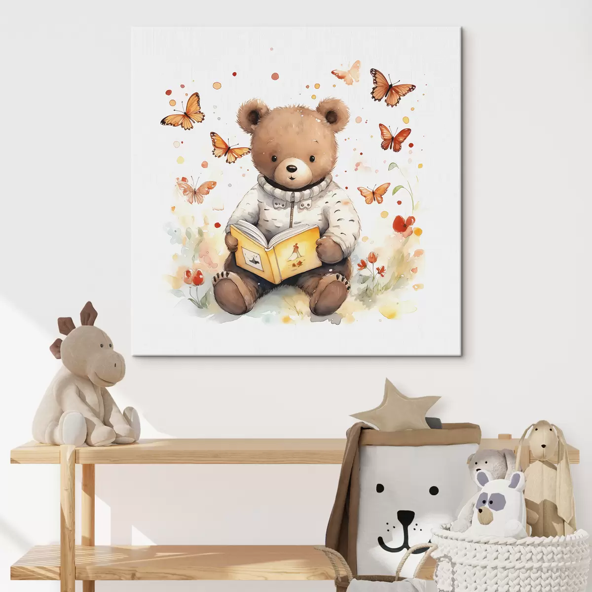 Obraz Medveď hnedý vo svetri číta knihu obklopenú akvarelovými motýľmi Nr. s39025