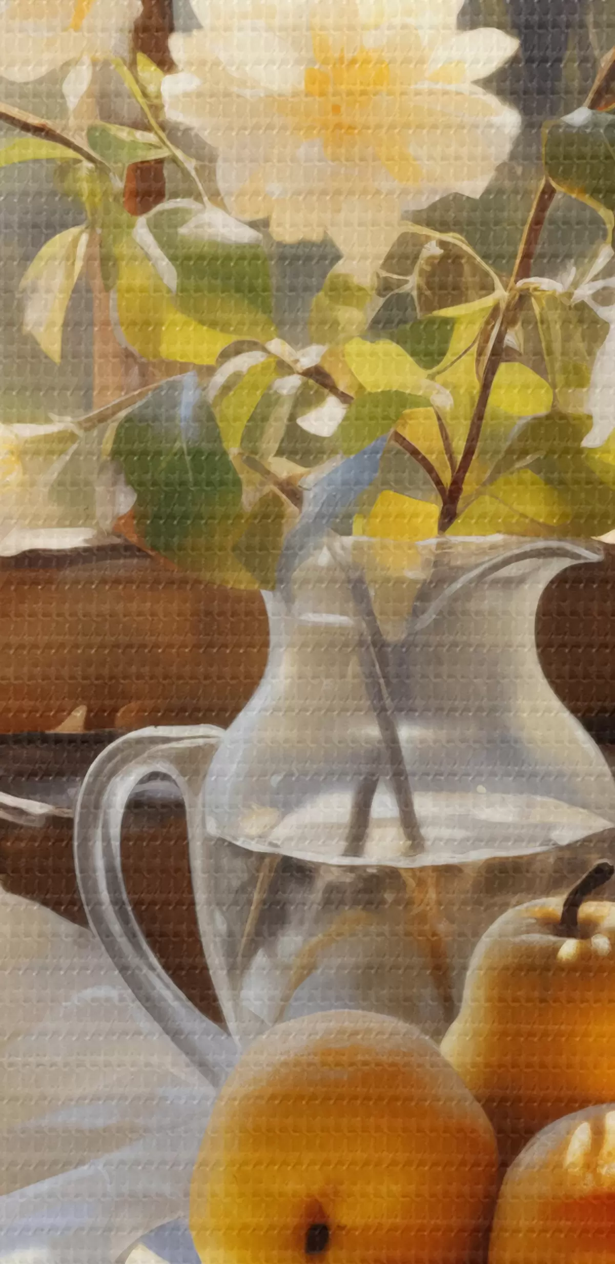 Obraz Rustikálne zátišie zo žltých zrelých hrušiek na tanieri na stole pri okne, biele ruže v sklenenom džbáne, biele čipkované závesy Nr. s39129