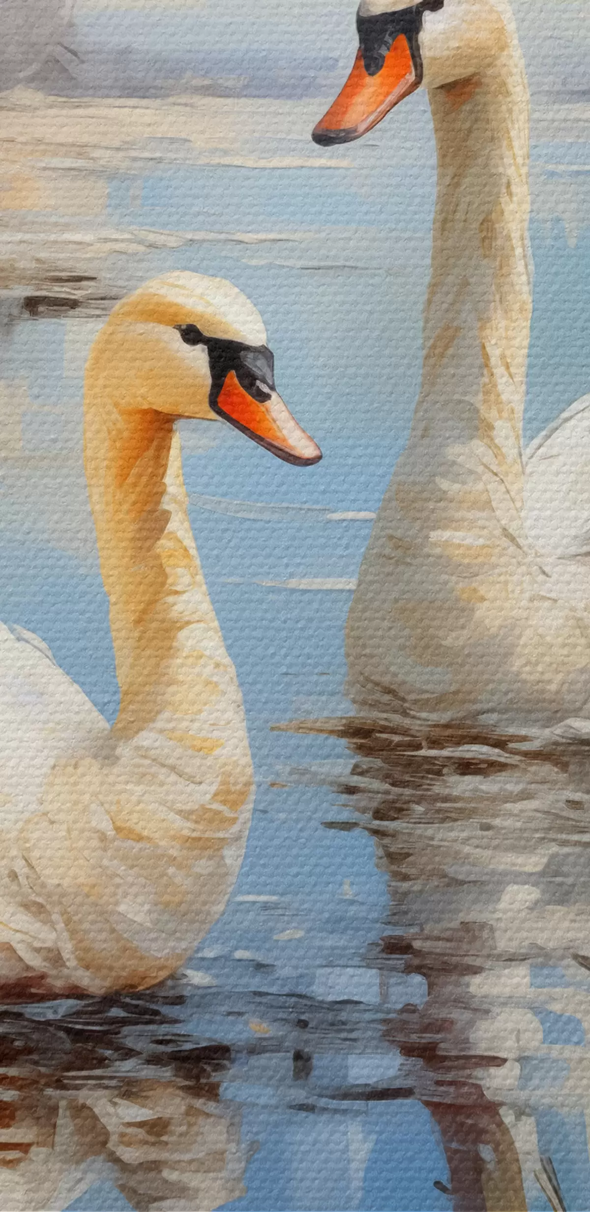 Obraz Biele husi plávajú pozdĺž rieky medzi trstinou, modrá, biela, béžová farba Nr. s39130