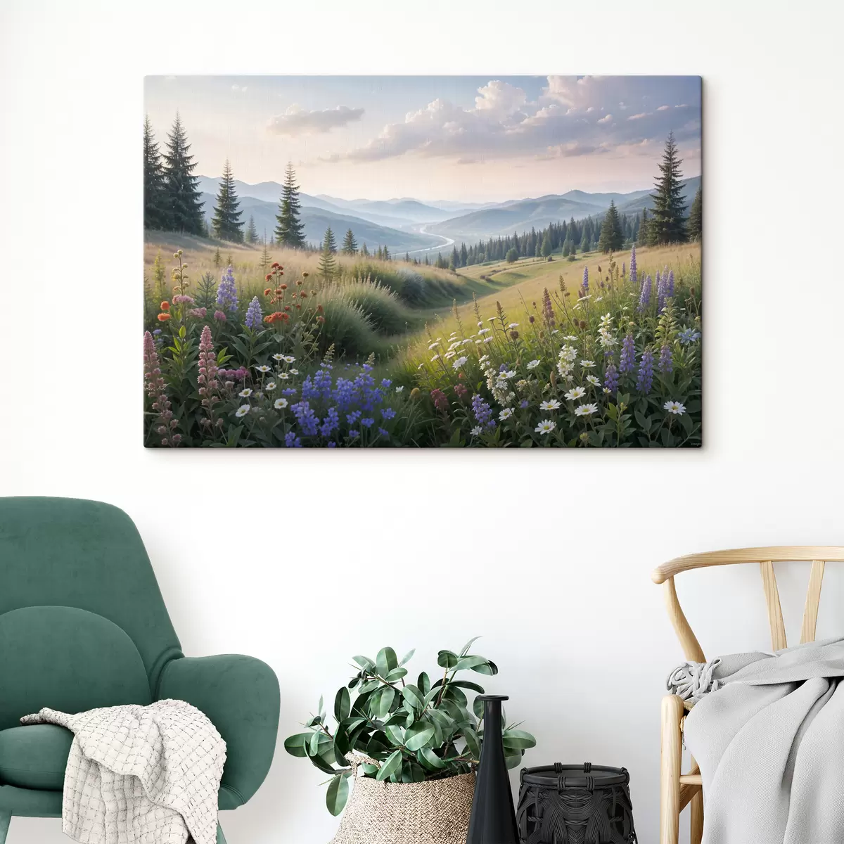 Obraz Horská krajina s trávnatou lúkou v popredí plnou farebných poľných kvetov Nr. s39382