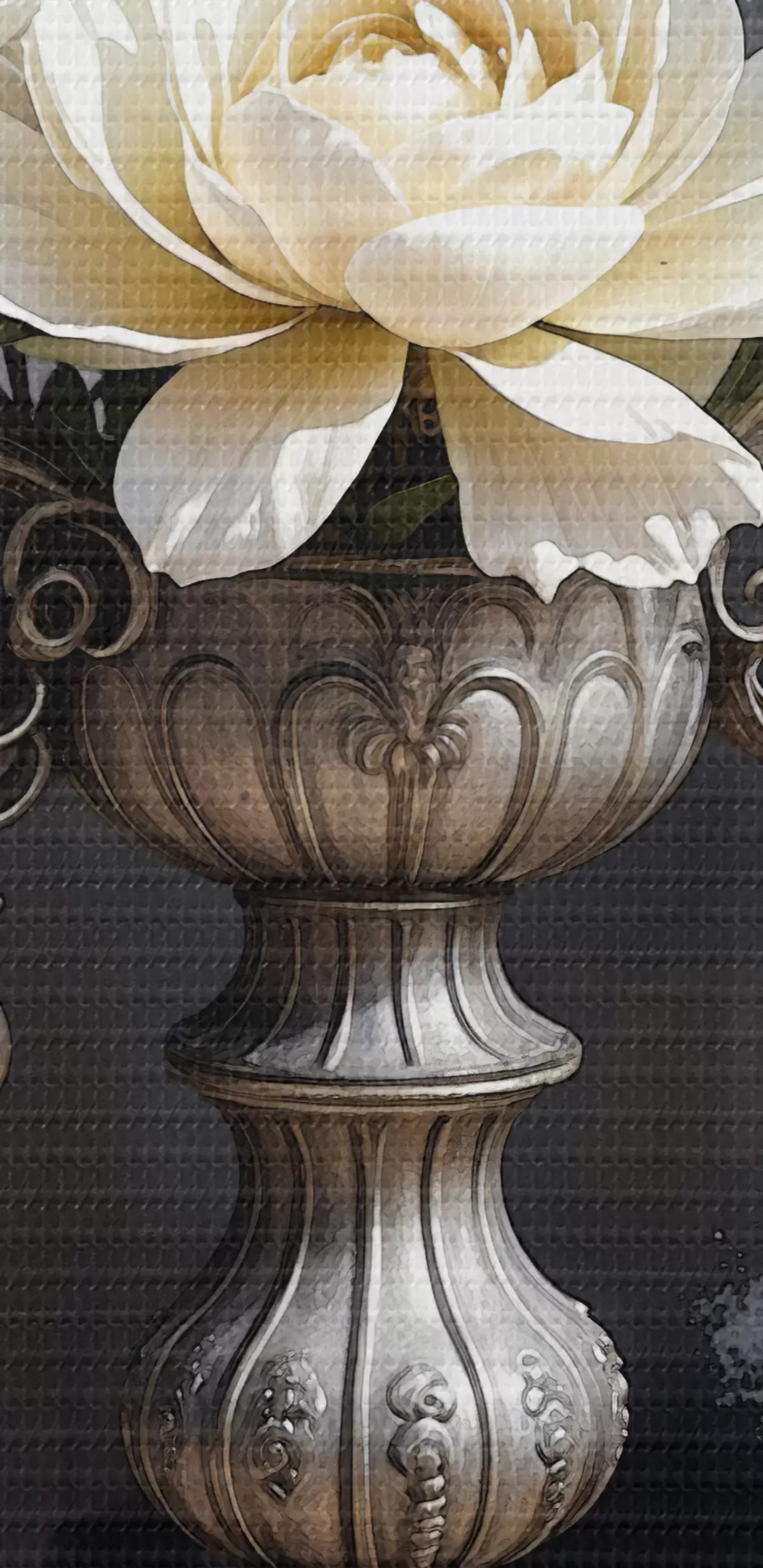 Obraz Kytica veľkých bielych kvetov georgín v zdobenej striebornej váze, obklopená zapálenými sviečkami na drevenom stole Nr. s39384