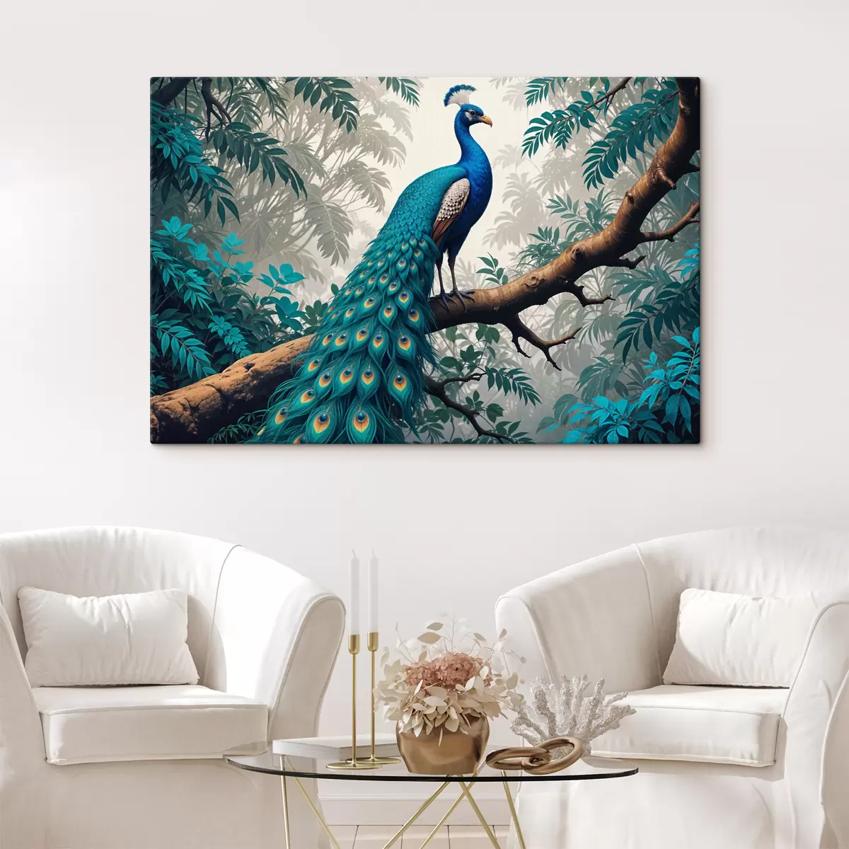 Obraz Žiarivý modrý páv sediaci na vetve stromu v bujnom tropickom lese Nr. s39401