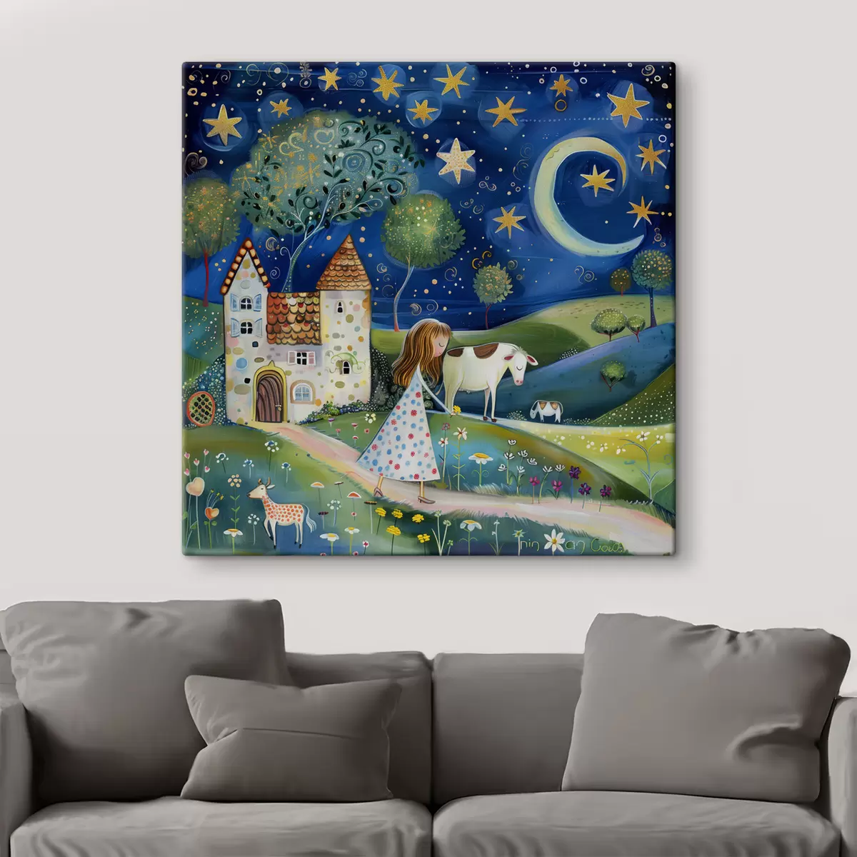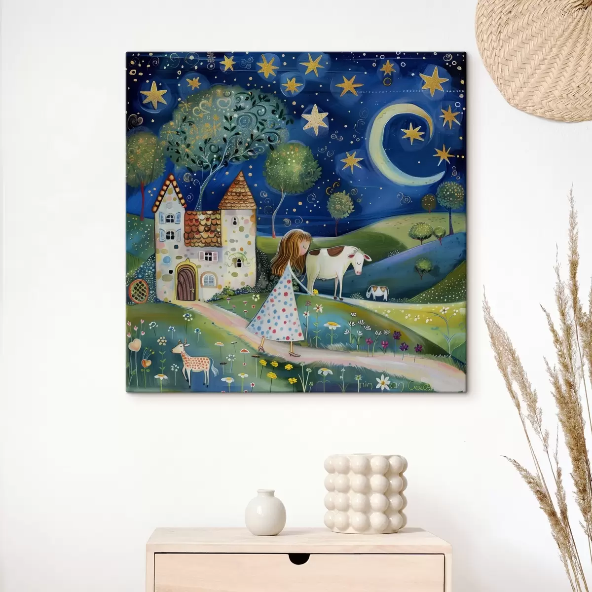 Obraz Malá princezná, psík, kravička a fantastický domček pod hviezdami v rozmarnom naivnom umeleckom štýle Nr. s39451