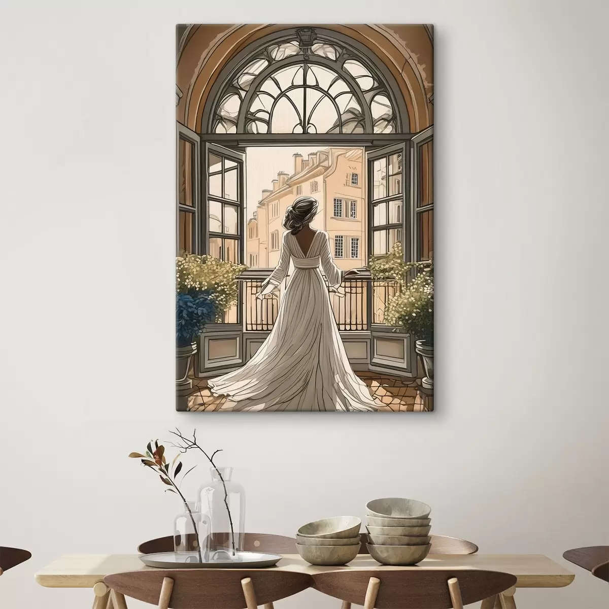 Obraz silueta dievčaťa v bielych šatách pri veľkom okne Nr. s39480
