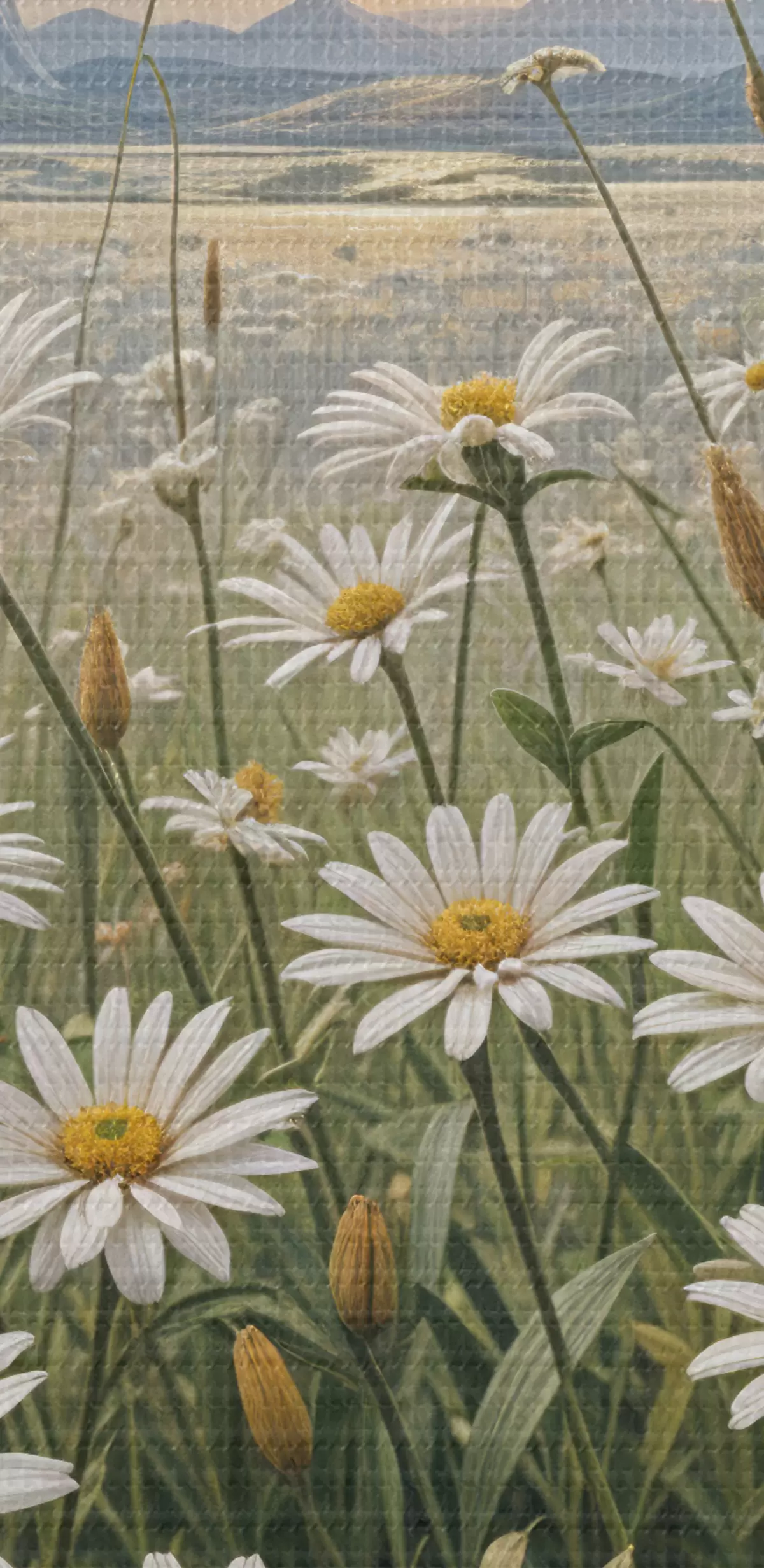 Obraz Pole bielych kvetov sedmokrásky v popredí s krajinou hôr a zamračenou oblohou Nr. s39528