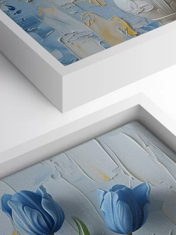 Obraz Modré a žlté tulipány v 3D: elegantný olejomaľovaný nástenný obraz s bielym a svetlomodrým pozadím a gravírovanou vázou Nr. s39637