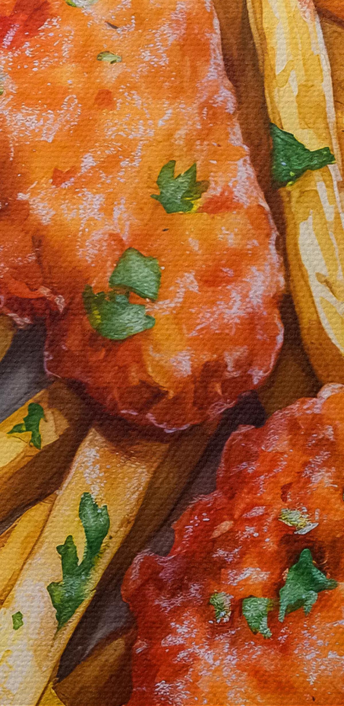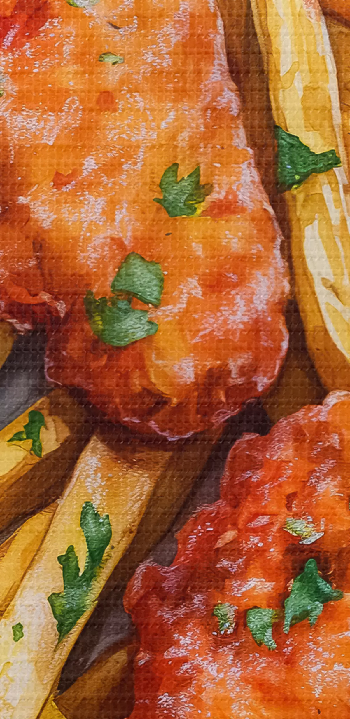 Obraz Akvarel food art, hranolky s pečeným kuracím mäsom, chutné Nr. s39708