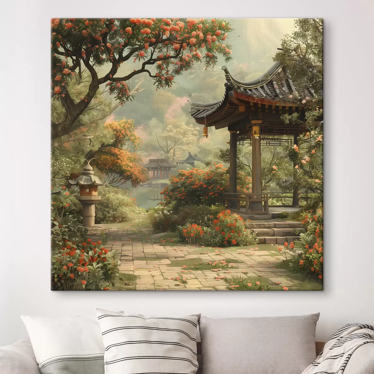 Obraz Japonský park s rozkvitnutými stromami a kvetmi, les, záhradný domček, jazero Nr. s39772