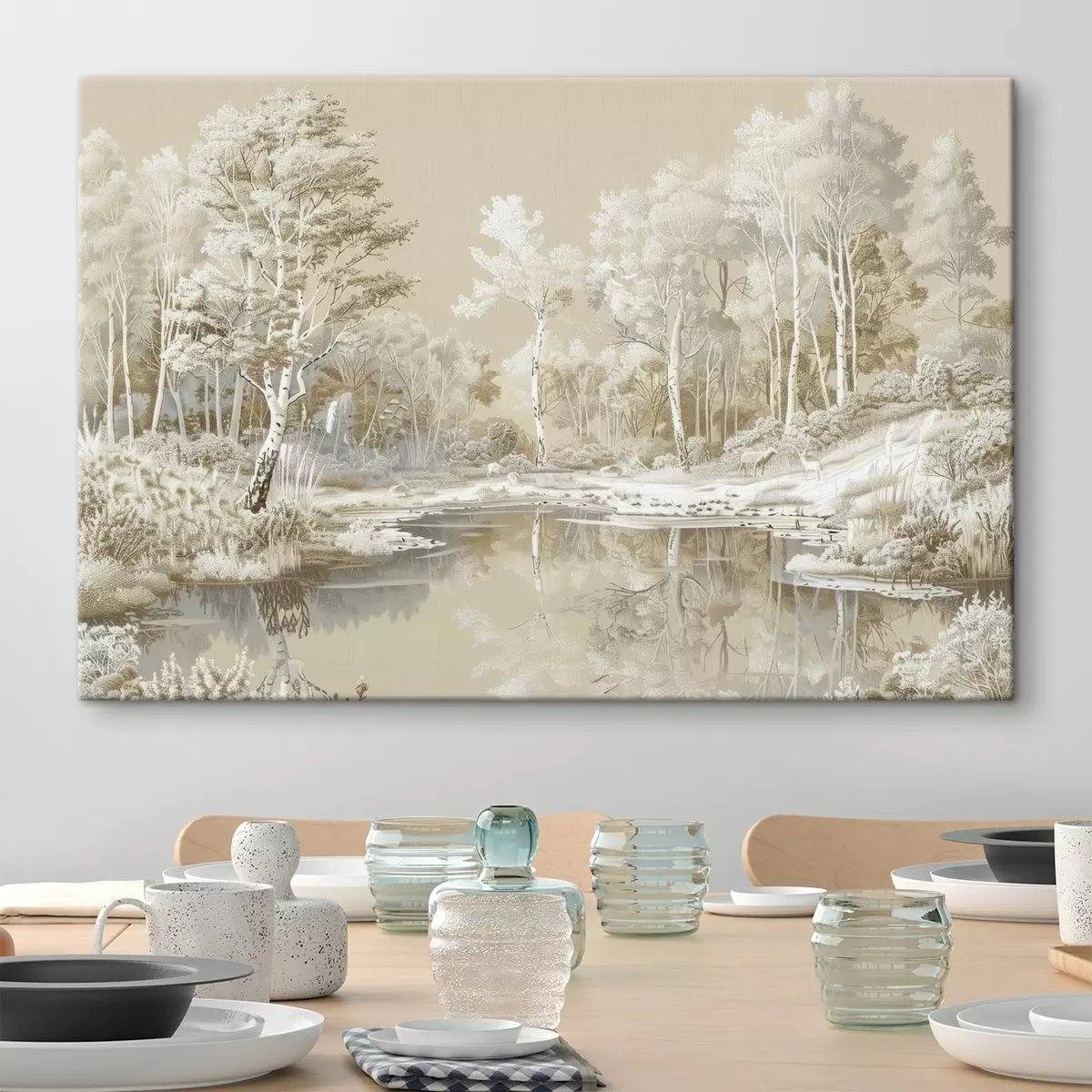 Obraz Krásna lesná krajina, jazierko a stromy, béžové a biele farby Nr. s39979