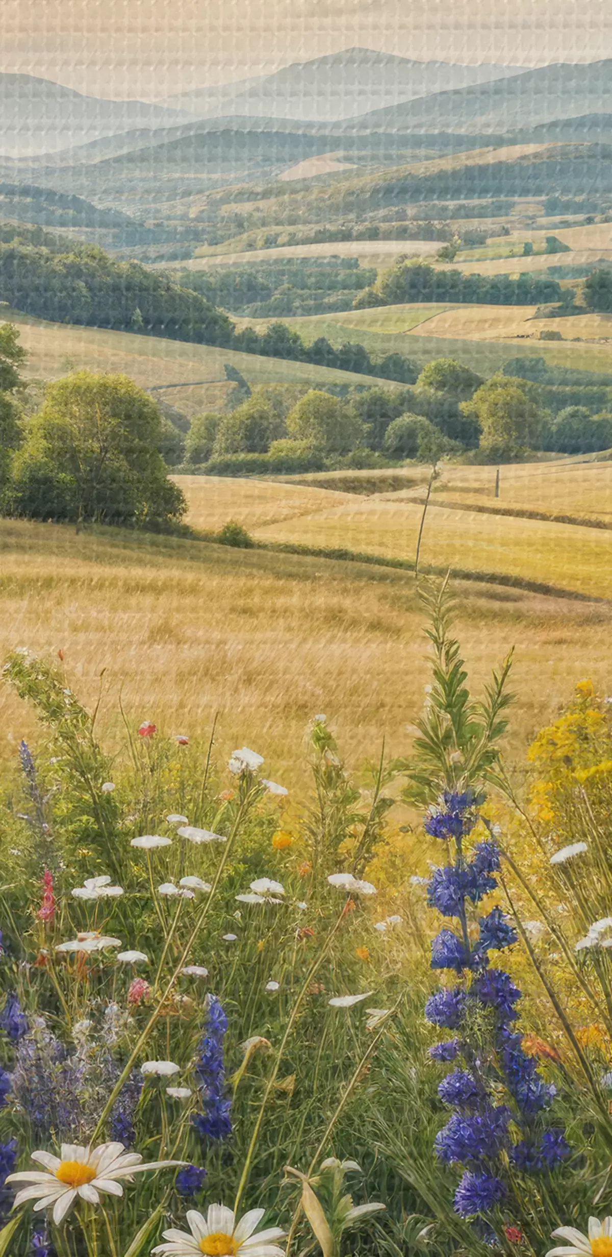Obraz Svieža vidiecka krajina so živou poľnou lúkou plnou farebných kvetov pod zamračenou oblohou Nr. s40018