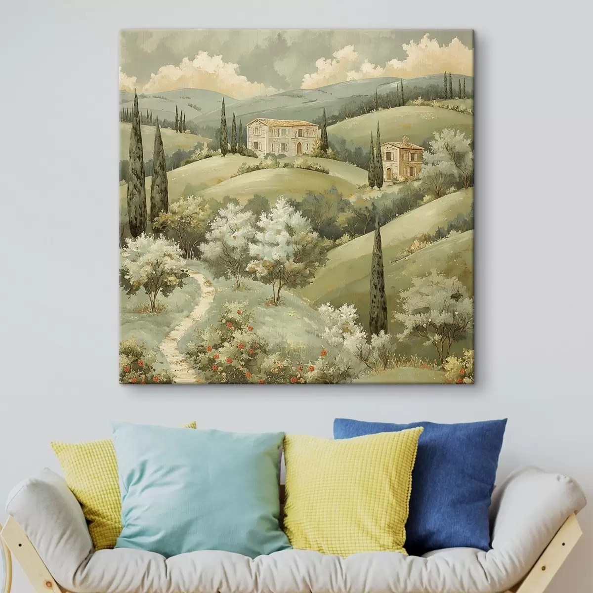 Obraz Krajina s vintage domčekmi, pastelové zelené farby, akrylová kresba, leto Nr. s40078