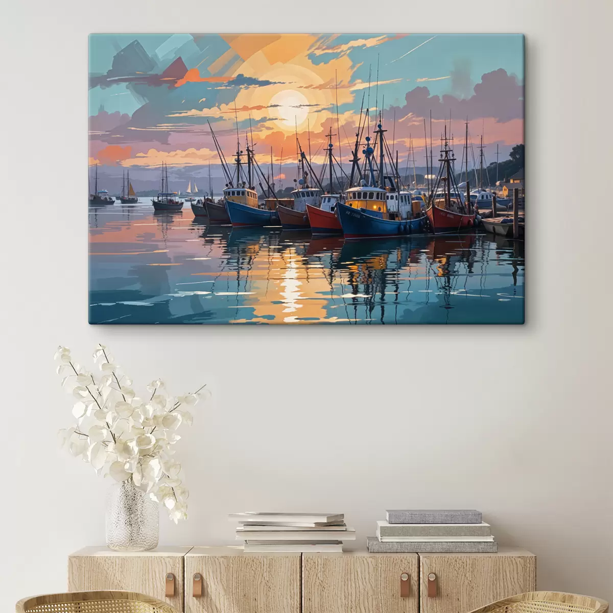Obraz Farebný západ slnka nad prístavom plným rybárskych člnov a lodí vytvára pokojnú a malebnú scénu Nr. s40158