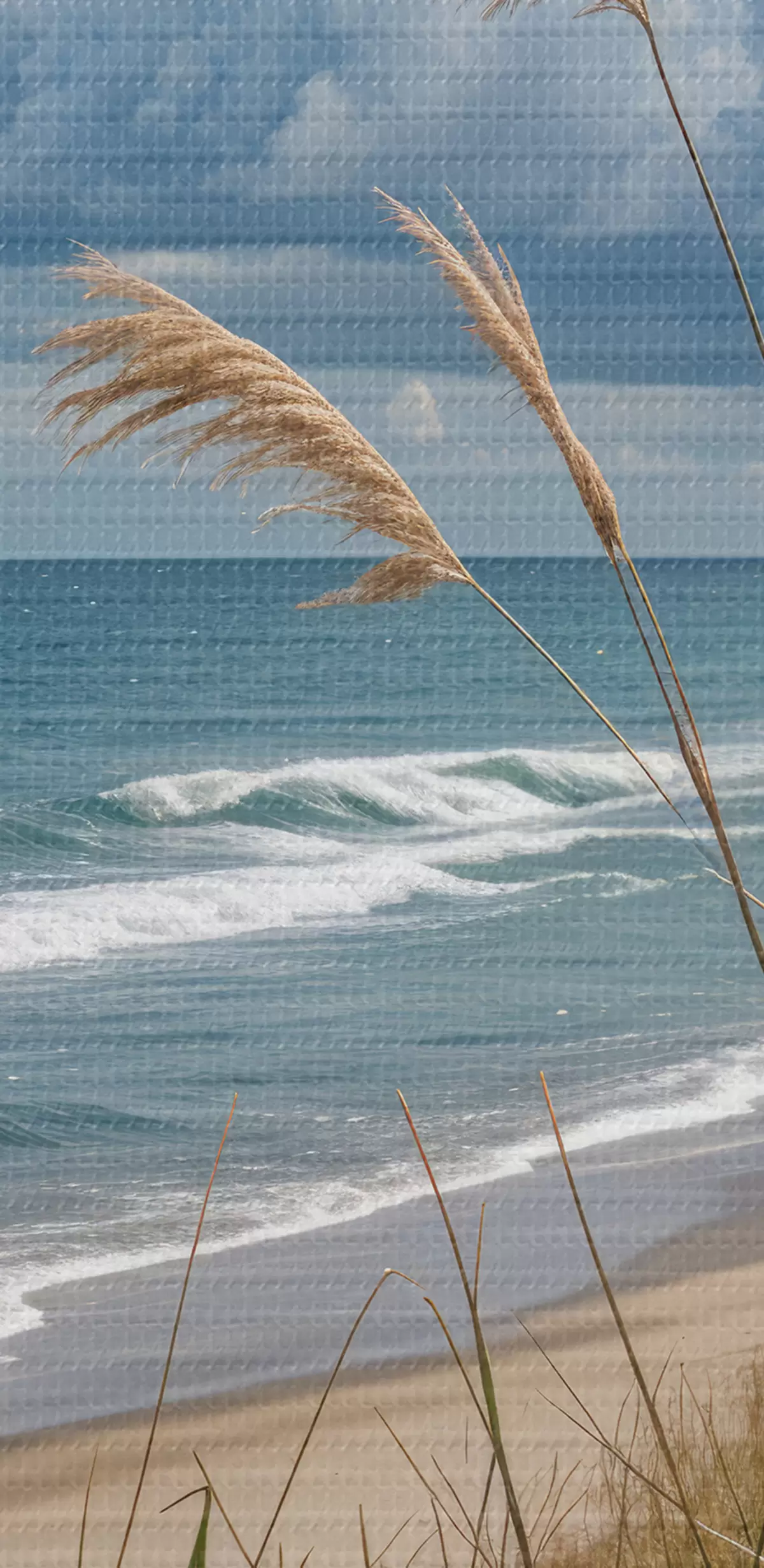 Obraz Malebná pláž s vysokou trávou kývajúcou sa vo vetre, s výhľadom na oceán s burácajúcimi vlnami a zamračenou oblohou Nr. s40161