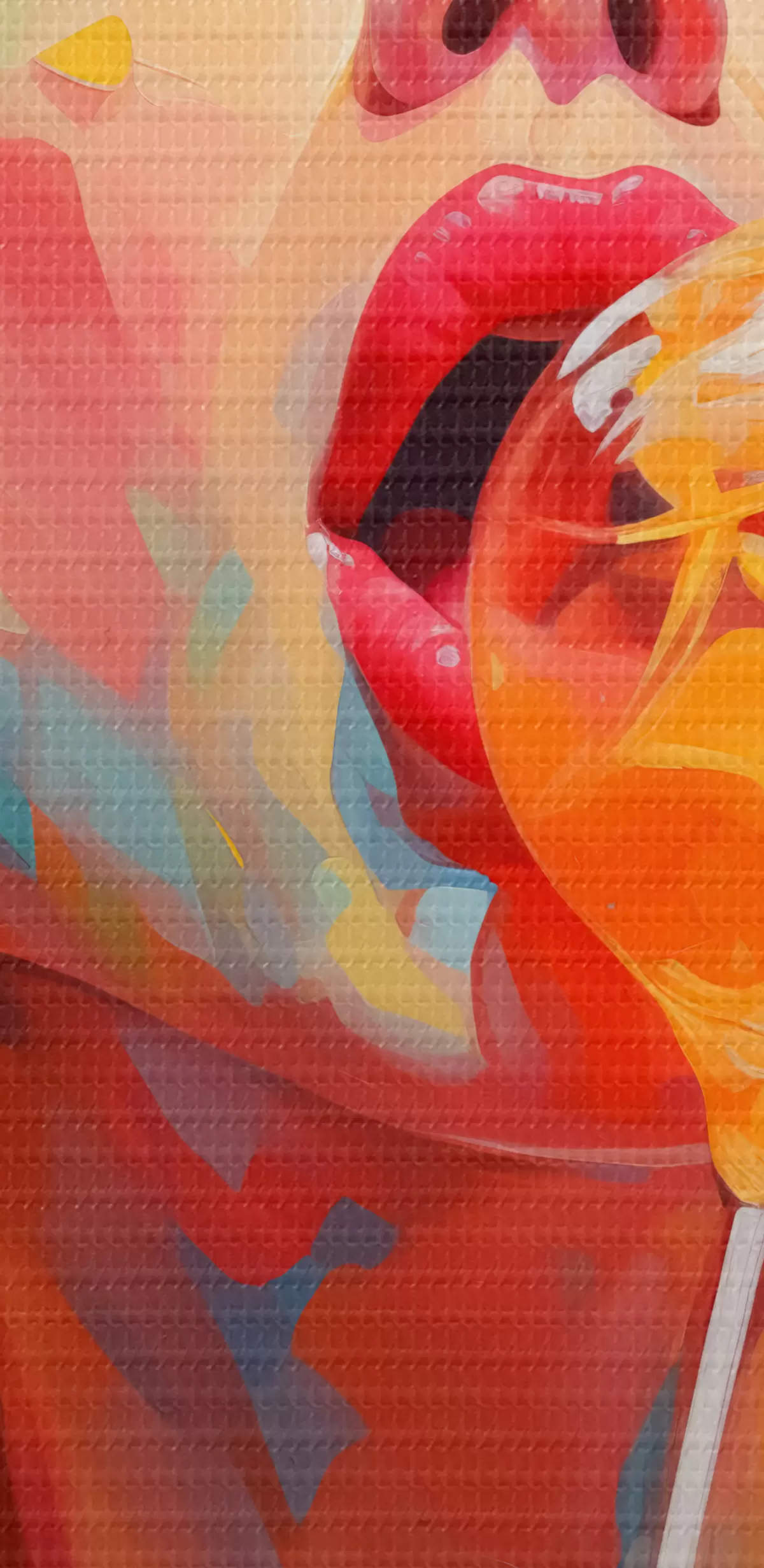 Obraz Dievča s kučeravými vlasmi v pestrých farbách olizuje lízanku Nr. s40213